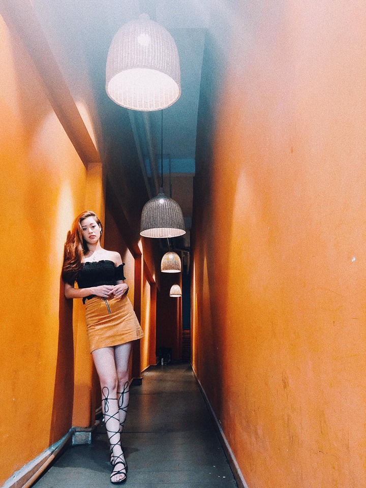 Khánh Vân dịu dàng với áo crop top bèo nhún cùng với váy màu cam đất , trang phục này rất thích hợp cho những ngày vào thu dịu mát, điểm nổi bật cho tổng thể trang phục là đôi sandals nữ đan dây cá tính