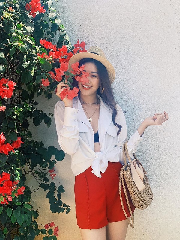 Đôi khi Khánh Vân cũng thay đổi style cá tính của mình sang một chút dịu dàng với áo sơ mi trắng buộc hờ hững lấp ló vòng 1 cùng quần đỏ lưng cao và mũ cói