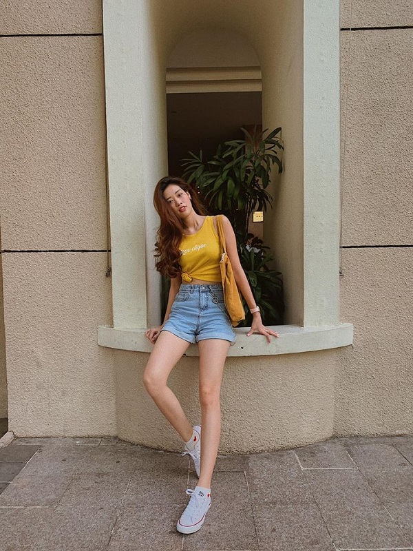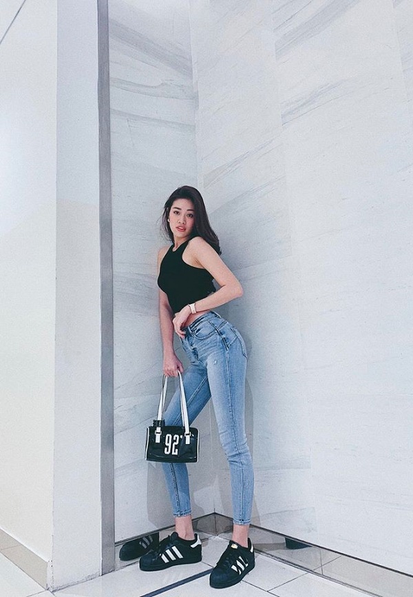 Tân Hoa hậu Hoàn Vũ Việt Nam 2019 thường xuyên chọn dáng áo sát nách croptop mix cùng jeans và giày thể thao torng hầu hết các bộ ảnh chụp streetstyle