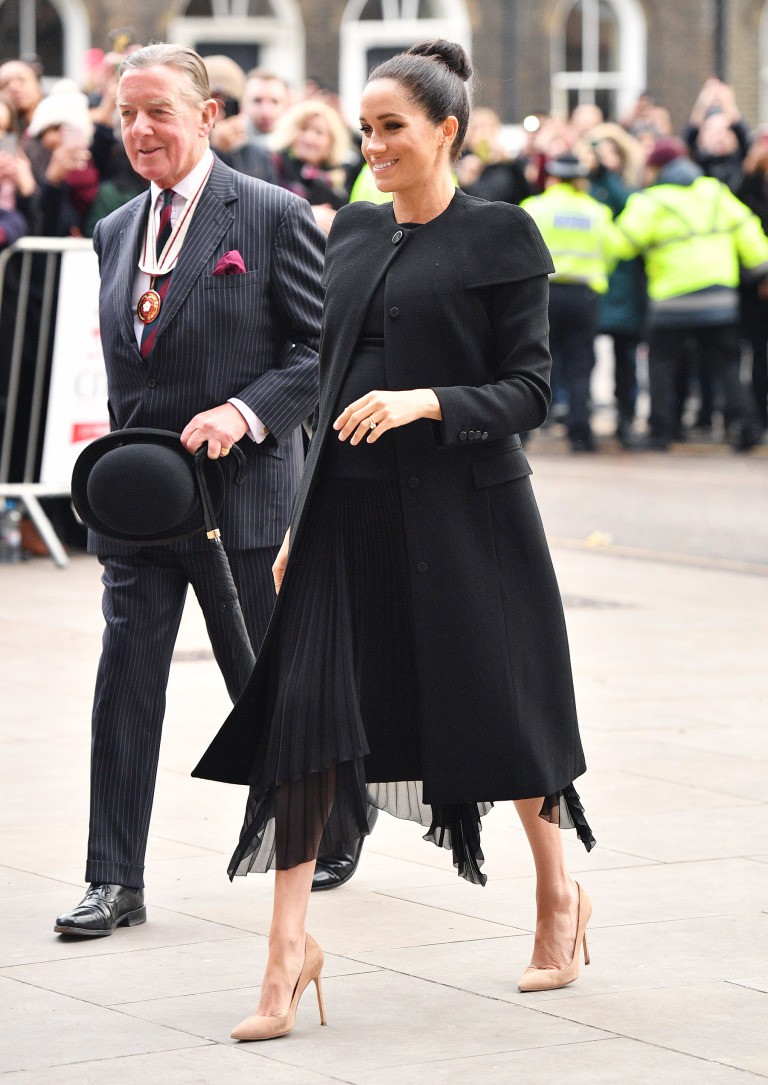 Trong lần xuất hiện gần nhất, Công nương Meghan hoàn thiện phong cách với cả cây đen bao gồm áo len, chân váy xếp li nhỏ cùng áo khoác dạ đến từ nhà mốt Givenchy.