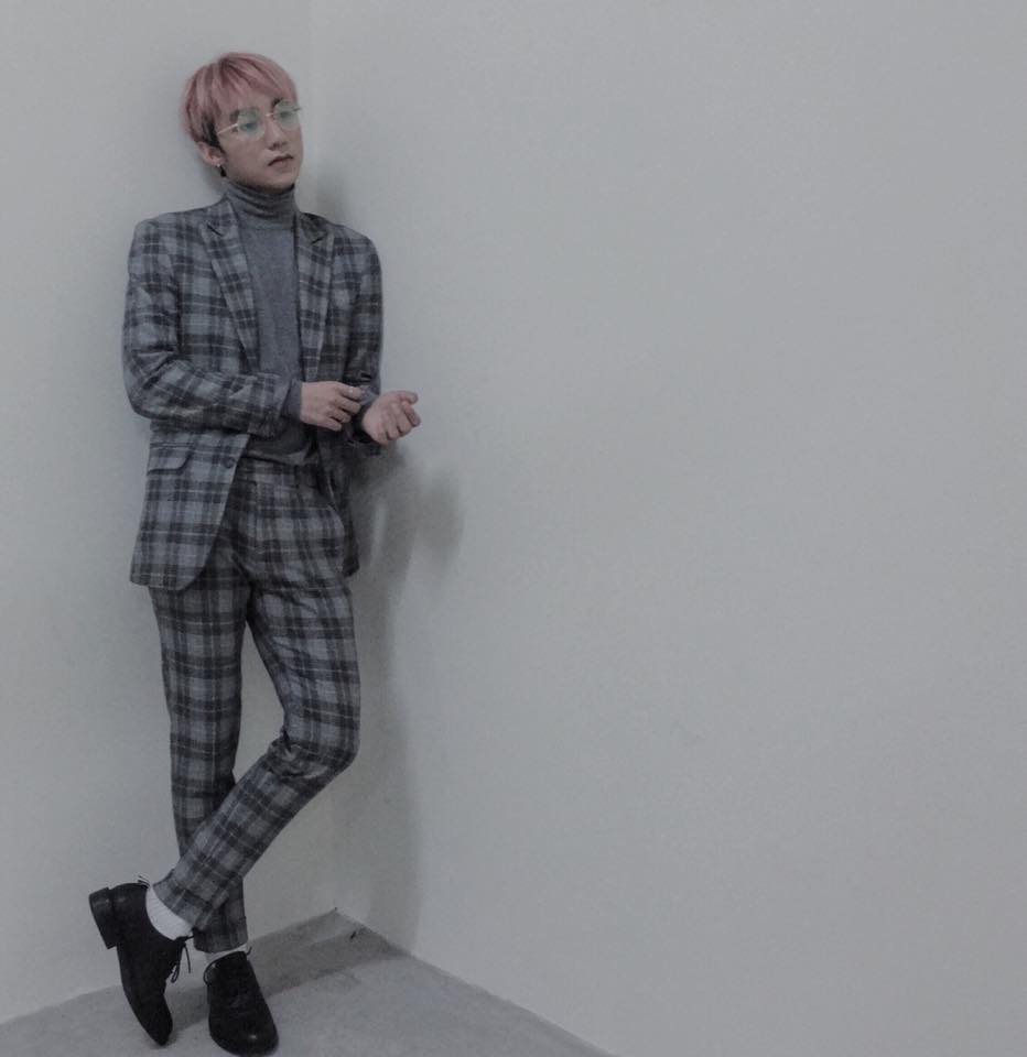 Sơn Tùng là một nam ca sĩ không cố định với style thời trang nào. Vest kẻ caro mix cùng áo thun cao cổ, giày tây đen và mái tóc nhuộm phớt hồng cực đặc biệt.