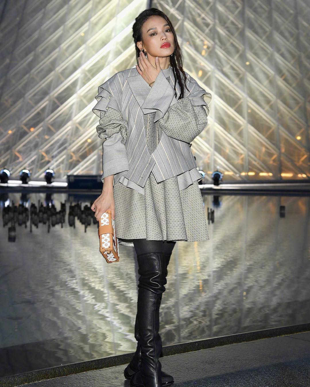 Cô chọn cho mình trang phục váy thiết kế cách tân màu xám ghi cùng đôi boots da cổ cao , được biết thiết kế này thuộc BST mới của nhà mốt Louis Vuitton