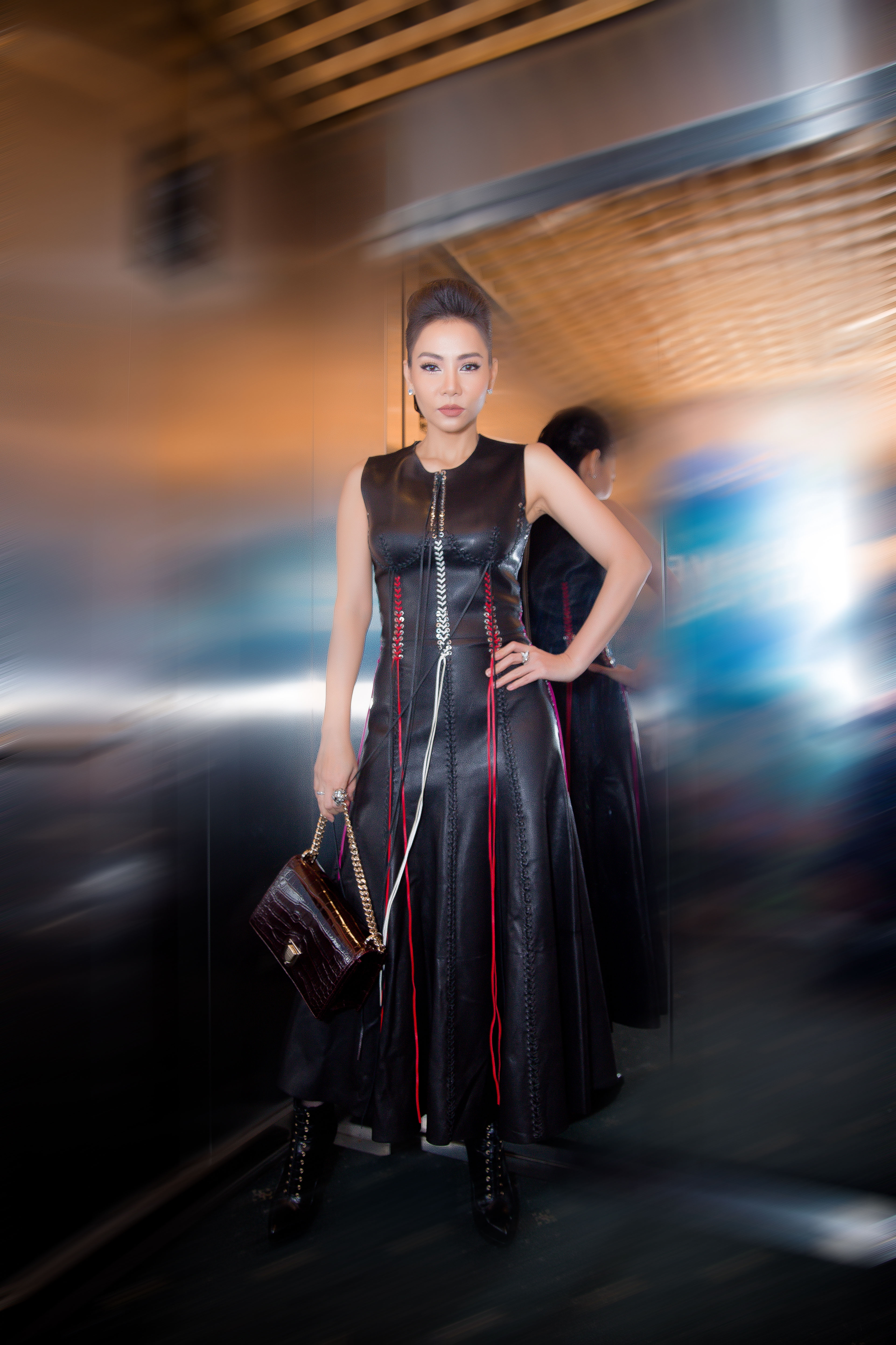 Với chiếc váy đan thắt dây trên nền chất liệu da, Thu Minh lựa chọn cách chải tóc hất ngược ra sau để tôn lên khuôn mặt đẹp quyền lực. cách trang điểm nhấn nhá vào đôi mắt chải xếch, làn môi tông đất cũng hoàn toàn phù hợp với tổng thể.