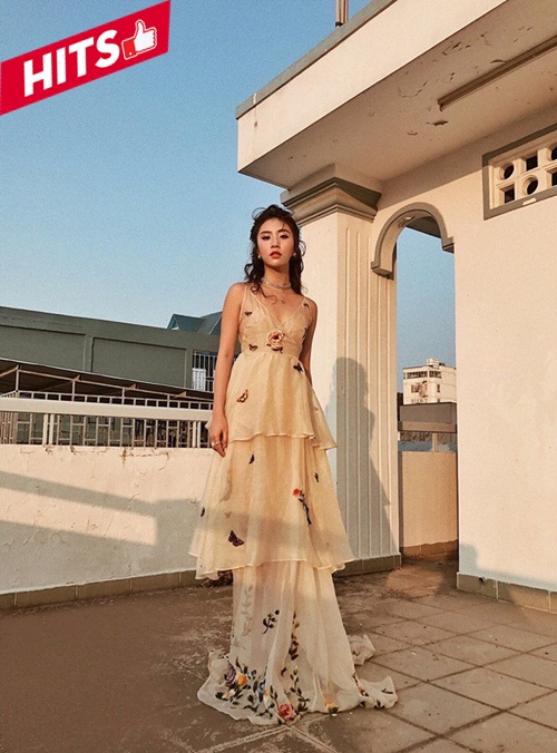 Quỳnh Anh Shyn diện mẫu đầm nhẹ nhàng, mỏng manh của NTK Trần Hùng. Với góc chụp nghiêng, trông cô chẳng khác gì siêu mẫu. Chiếc váy thực sự rất hợp với kiểu tóc xoăn hot trend đang làm chị em điệu đứng thời trang qua.