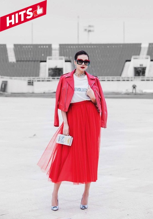 Thanh Hằng diện nguyên cây Dior khi xuất hiện tại một sự kiện tại Hà Nội. Vừa cá tính với áo khoác da nhưng cũng yểu điệu, nữ tính trong chân váy voan bồng bềnh tông xuyệt tông cùng màu đỏ nổi bật.