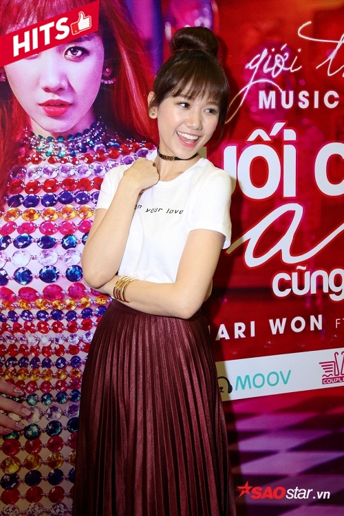 Hari Won trong buổi họp báo ra mắt sản phẩm âm nhạc mới, đúng với concept được xây dựng trong MV, đầy màu sắc và trẻ trung vô cùng. Với sự giảm cân ngoạn mục, cô cũng nhận được rất nhiều lời khen ngợi mỗi khi xuất hiện.