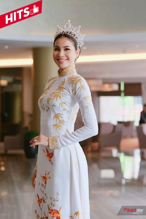 Phạm Hương tiếp tục lựa chọn áo dài truyền thống với họa tiết mang đậm nét văn hóa Việt cùng hình ảnh tre vàng xuất hiện một cách đầy mê hoặc trước công chúng. Hoa hậu luôn xinh đẹp dù biến hoá với bất cứ hình ảnh nào.