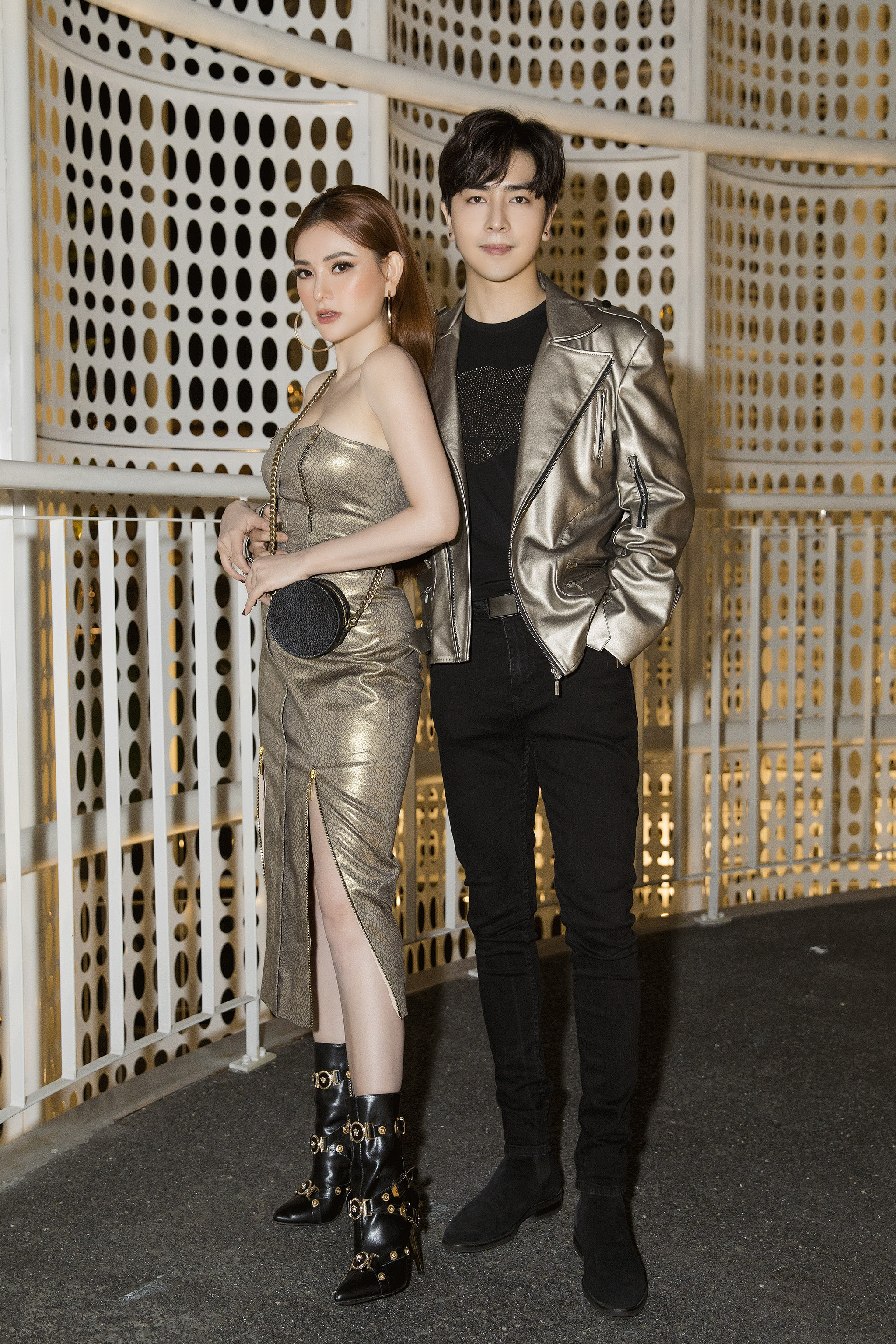 Cùng diện trang phục với tông màu ánh bạc chủ đạo, nếu Thu Thủy cực kỳ quyến rũ khi chọn kiểu váy ôm, có đường xẻ cao khoe đôi chân dài miên man thì Kin Nguyễn lại lịch lãm, trẻ trung cùng biker jacket mix cùng áo phông đính hạt đá họa tiết.
