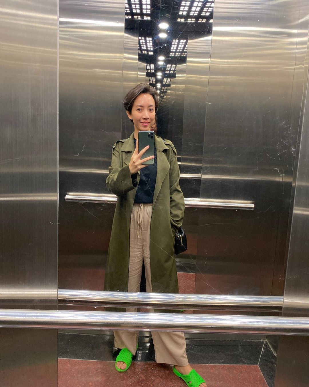 Dù ăn diện phong cách thế nào, cô nàng cũng không quên đôi dép tổ ong thoải mái, tiện dụng.