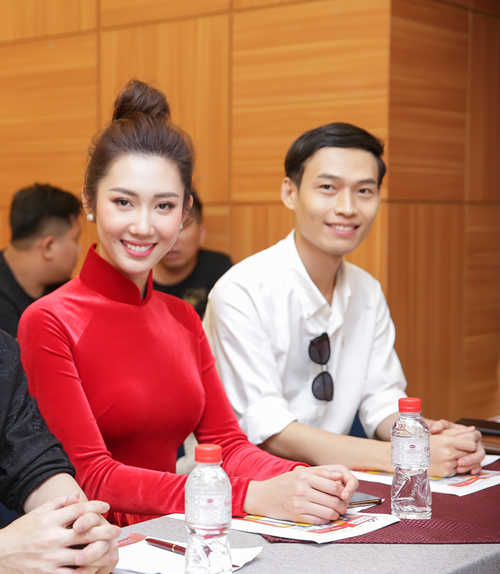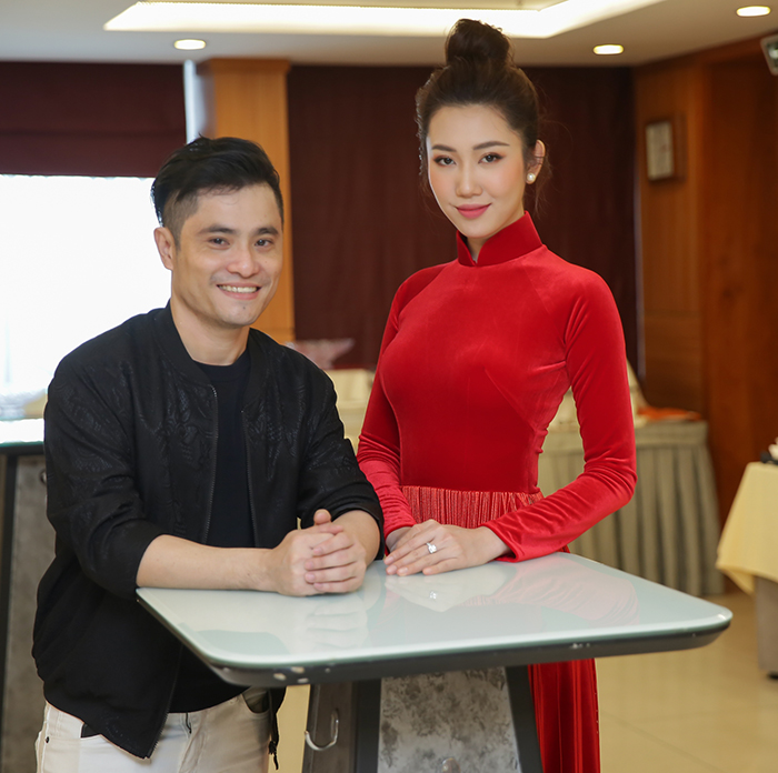 Thúy Ngân chụp hình cùng NTK Nhật Dũng, chiếc áo dài cô mặc được người anh trai thiết kế