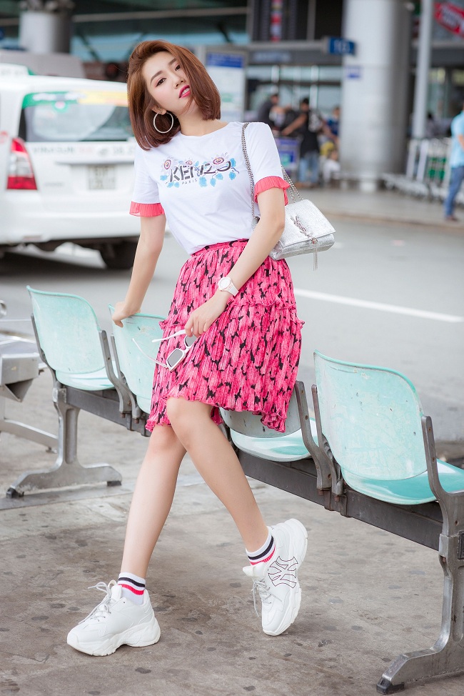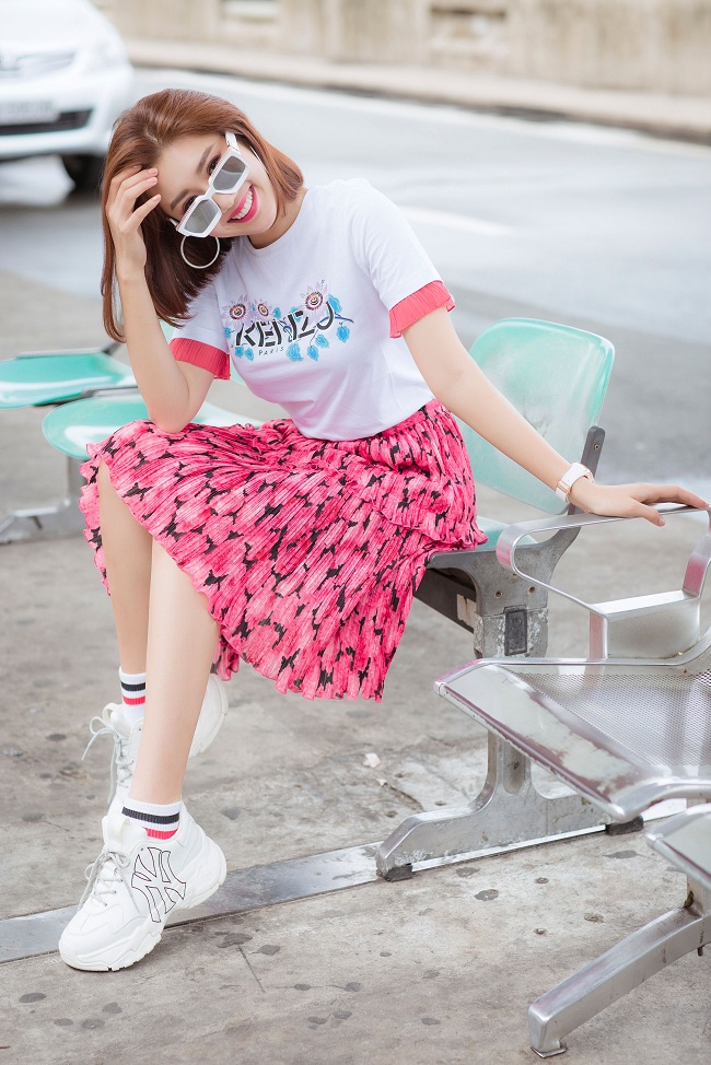Nữ diễn viên phối áo thun kèm chân váy họa tiết xếp li và giày sneaker, cho vẻ ngoài năng động, trẻ trung.