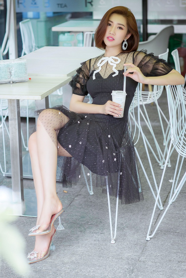 Thúy Ngân khoe nhan sắc mặn mà ở tuổi 29 với váy tông đen cùng chất liệu ren xuyên thấu mang đến cảm giác nhẹ nhàng, mềm mại.