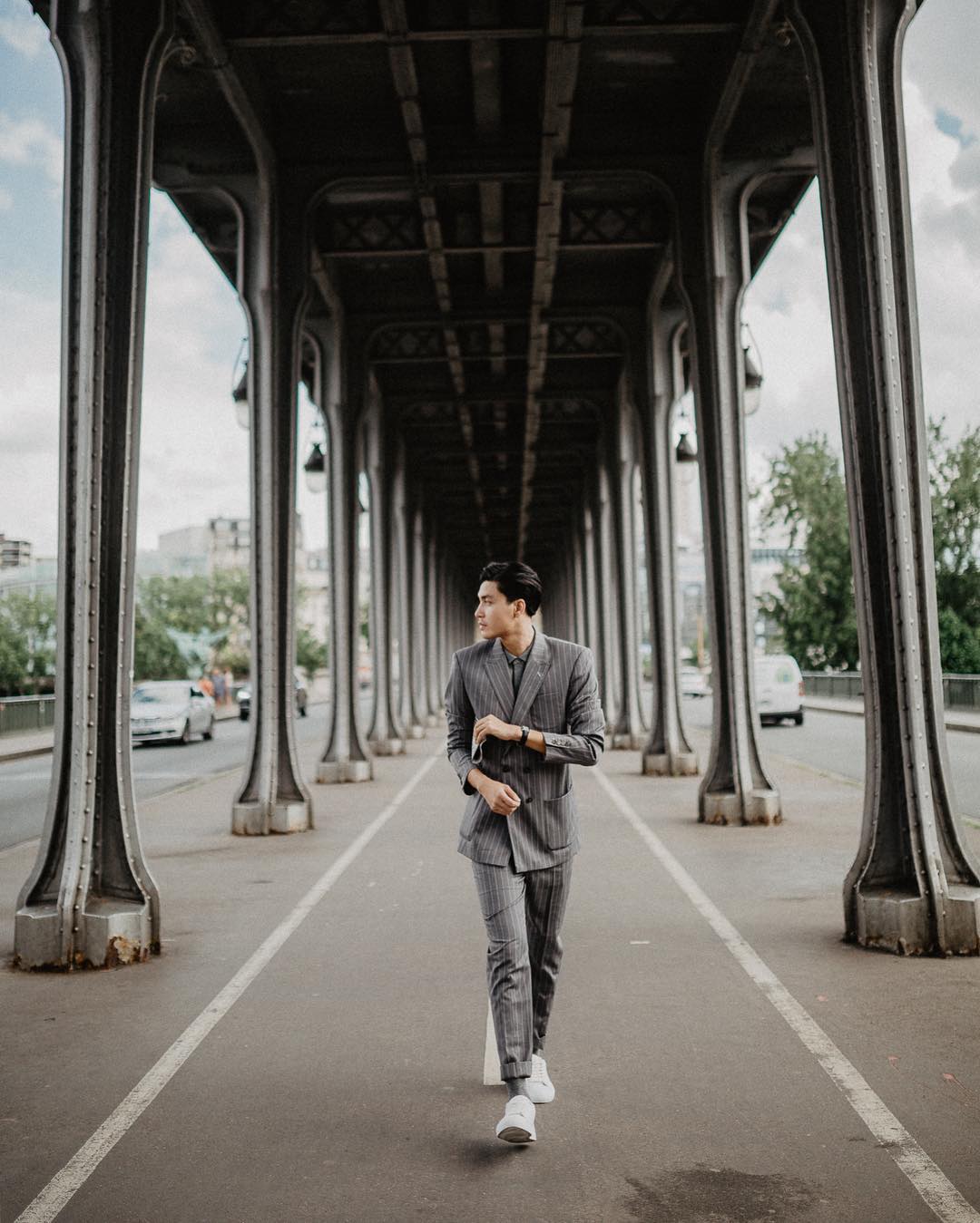 Người mẫu Quang Đại đem đến gợi ý cho các chàng trai bằng cây vest sọc tạo cảm giác lịch lãm nhưng vẫn hết sức trẻ trung nhờ cách phối cùng giày sneaker.