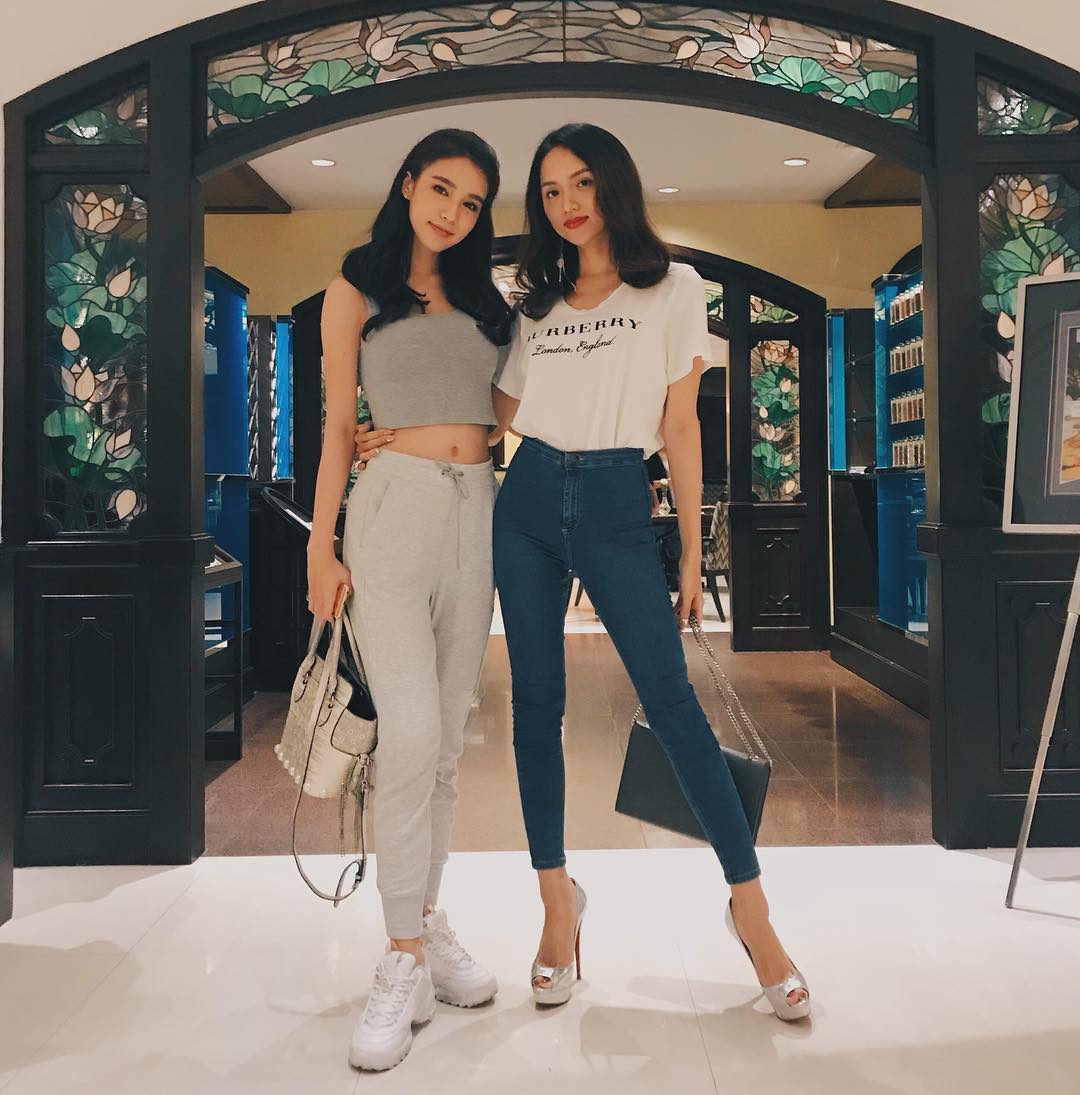Hoa hậu Hương Giang “đọ dáng” cùng người đẹp chuyển giới Thái Lan trong bộ cánh đơn giản gồm áo phông Burberry và quần jeans ôm sát.
