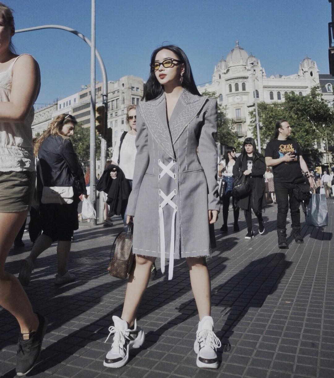 Châu Bùi chứng tỏ gu ăn mặc thời thượng với chiếc váy vai độn cá tính. Nàng fashionista còn khiến fan hâm mộ ghen tỵ khi khoe đôi giày Louis Vuitton Archlight đang gây “sốt”.