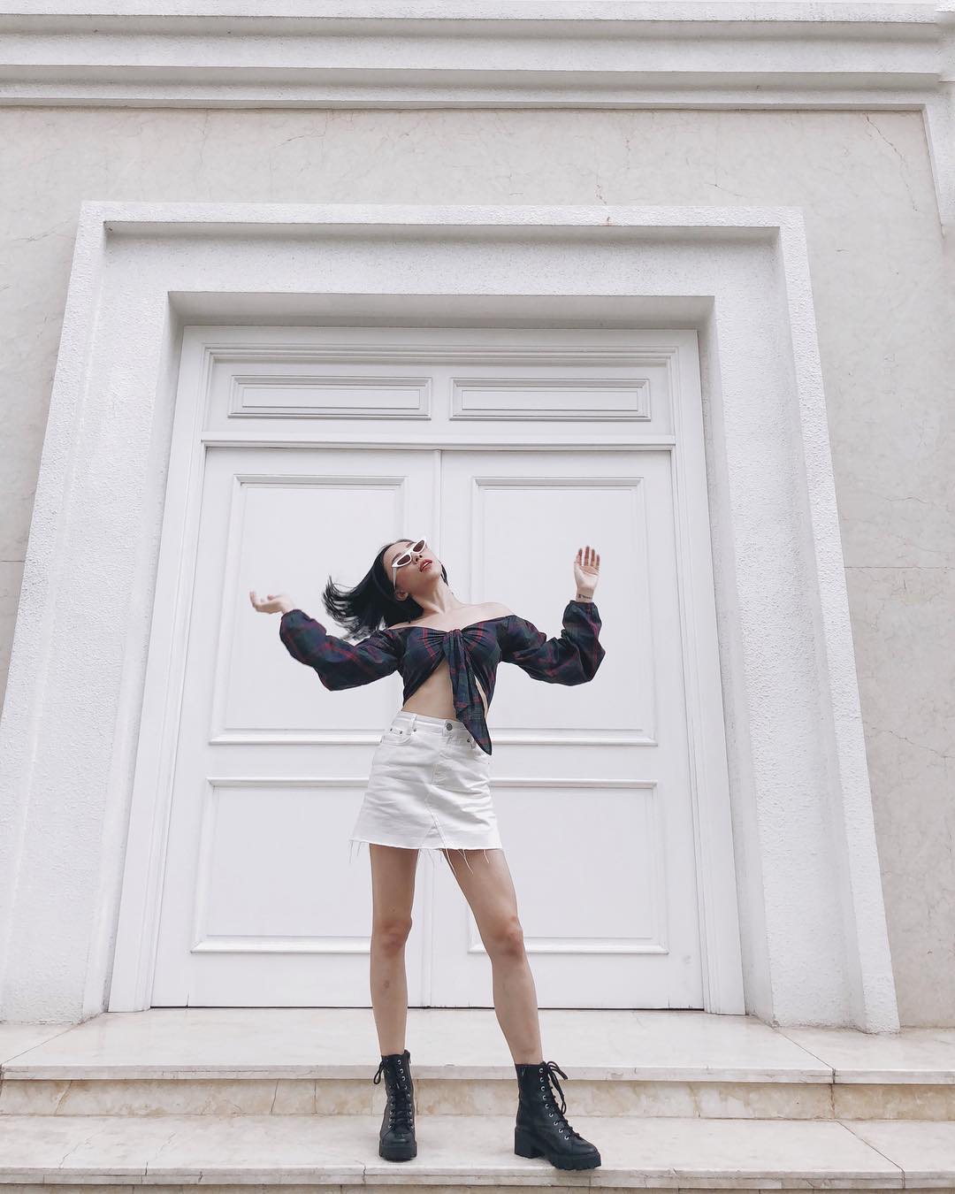 Tóc Tiên tiếp tục theo đuổi phong cách cá tính cùng áo croptop buộc nơ và chân váy ngắn, phối cùng boots cao.