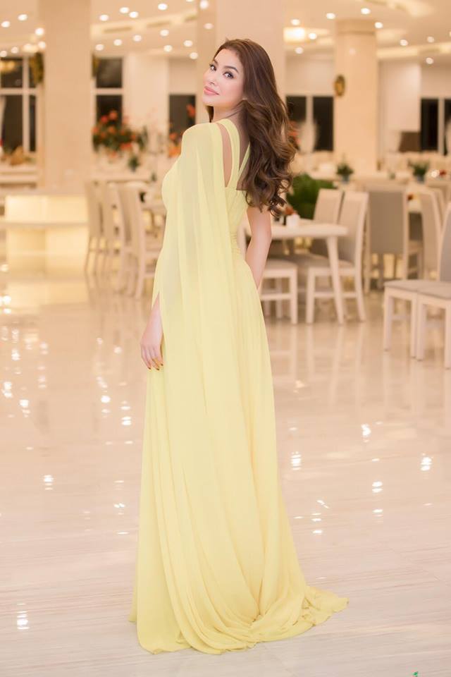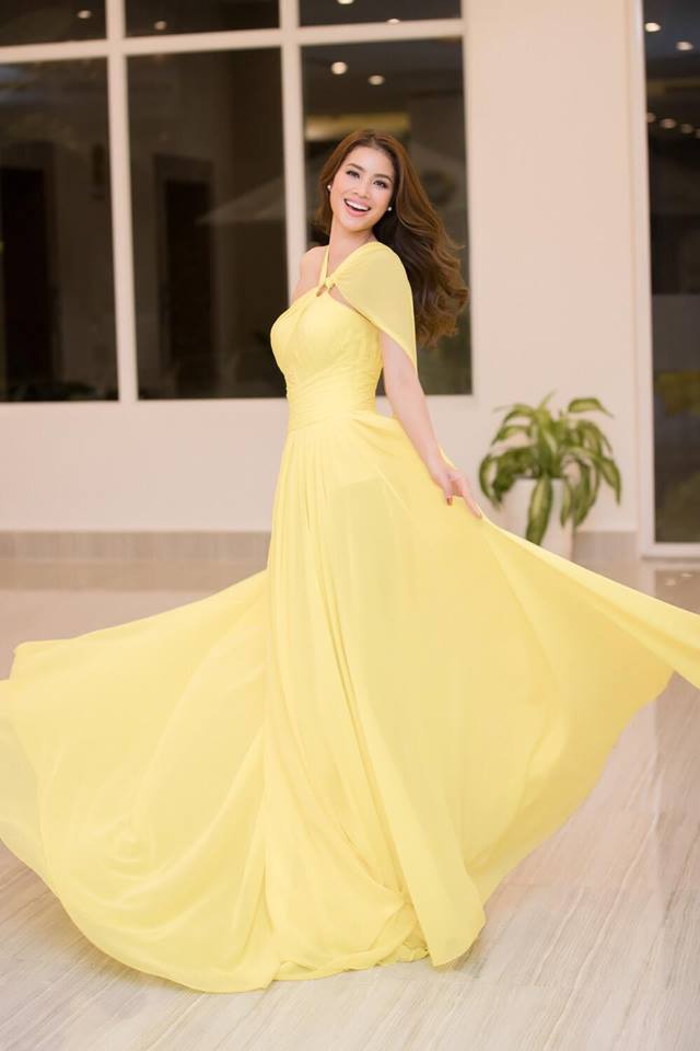 Màu sắc vàng chanh tươi trẻ cùng với chất liệu voan mỏng giúp cô trở nên nhẹ nhàng, nữ tính và mềm mại. Đặc biệt nàng hậu đã biết tương tác với váy áo để cho ra những bức hình đẹp mắt.