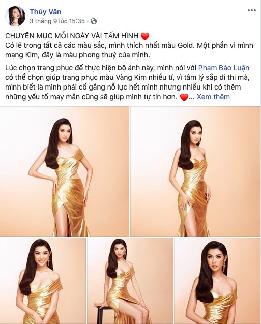 Chân dài sinh năm 1993 chia sẻ, trong tất cả các màu sắc, thì cô thích nhất màu Gold. Một phần vì cô thuộc mạng Kim, nên đây chính là màu phong thuỷ sẽ mang lại nhiều điều may mắn cho cô.