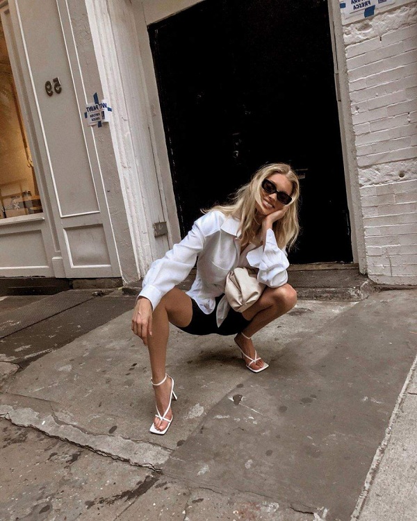 Thúy Vi hot gir thị phi trong set đồ y chang đen -trắng với áo sơ mi mix cùng biker short đen và sandals xỏ ngón trong hình streetstyle mới nhất