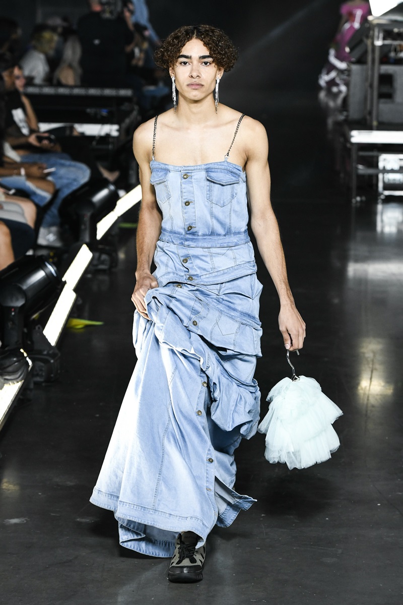 Thiết kế lạ mắt, tùng váy denim chia tầng bằng những dải bèo nhún được trình diễn bởi người mẫu nam cũng thu hút nhiều sự chú ý.