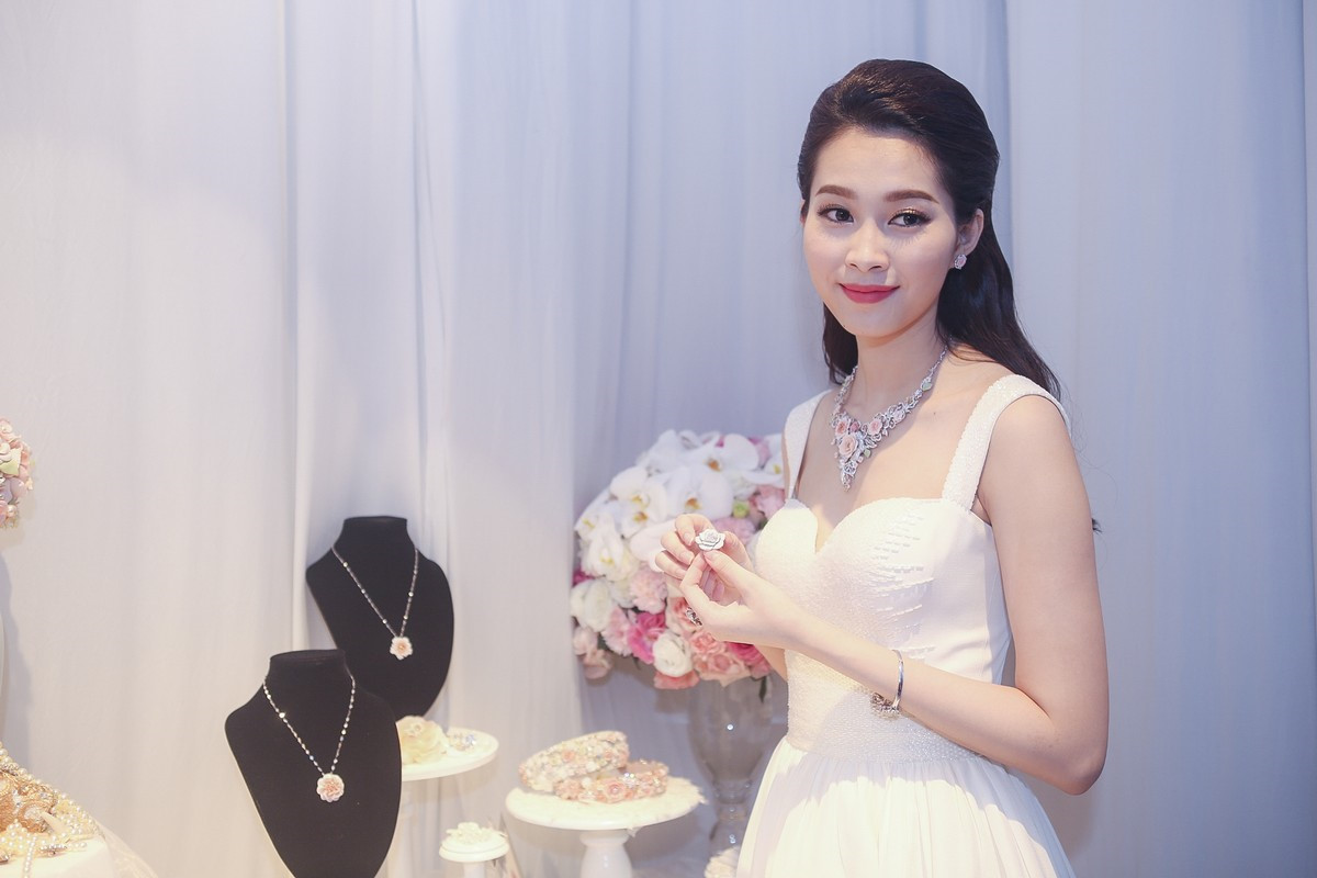 Váy cưới đính hoa nhẹ nhàng với những họa tiết trang trí là lựa chọn mà hoa hậu không nên bỏ qua. Khoác lên mình chiếc váy cưới đẹp nổi bật bằng chất liẹu vải sheer, cô dâu trông thật ngọt ngào.