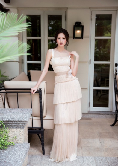 Thiết kế thủ công làm bằng sợi tơ tằm dáng dài là một lựa chọn khôn ngoan dành cho dáng người mảnh. Tông màu nude tôn làn da trắng trẻo, còn lớp váy xếp tầng tô điểm tổng thể trang phục cho nàng “bông hậu”.