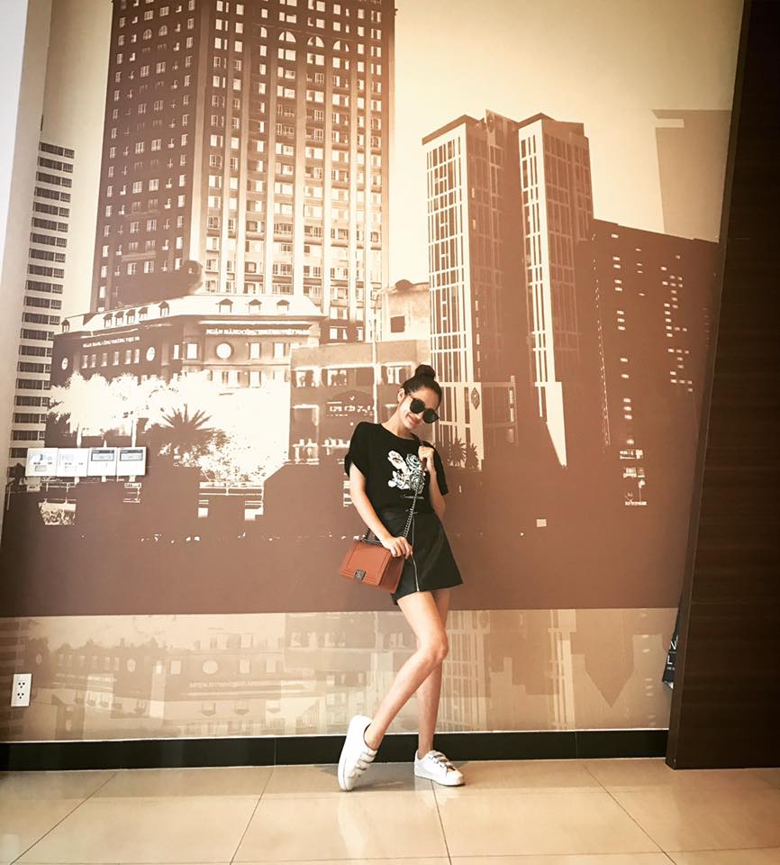 Biến hóa phong cách một chút nhưng vẫn không thể chệch đi đâu được chiếc áo thun đó. Chưa kể đôi sneaker cũng xuất hiện cùng cô nàng khá nhiều lần.