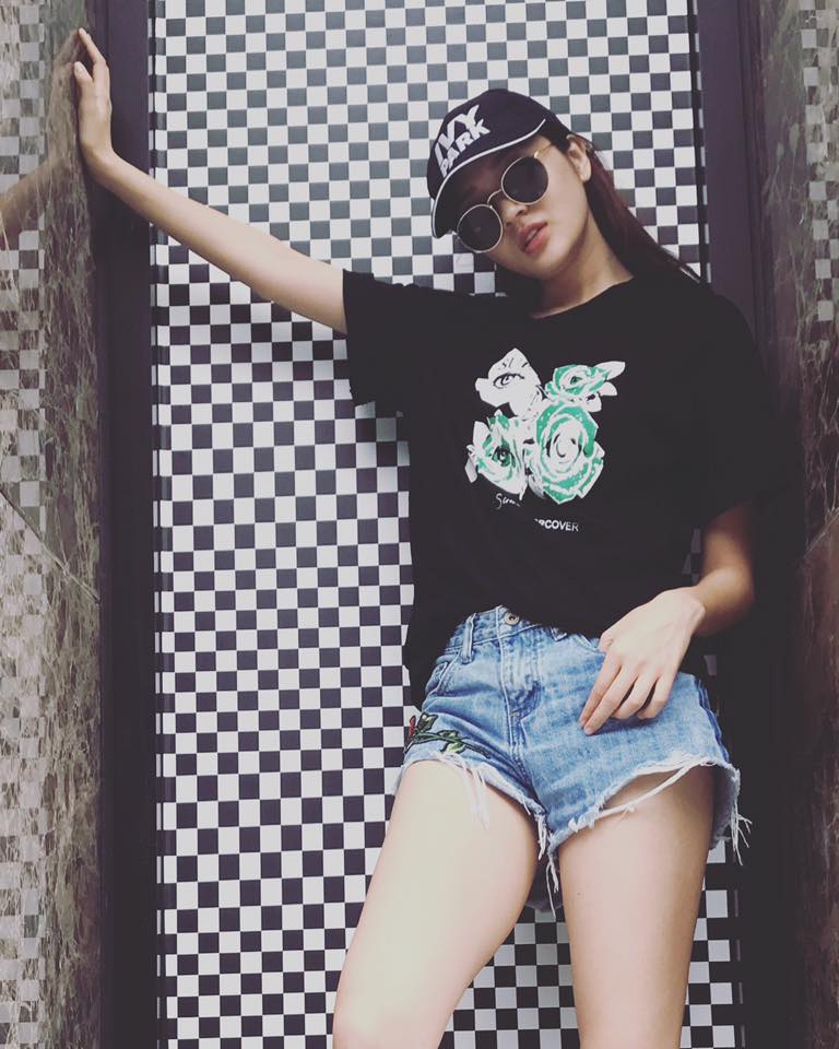 Và rồi lại thêm một lần cô nàng tự tin diện chiếc áo với quần short jeans siêu ngắn, thêm chiếc mũ lưỡi trai, Bảo Anh có diện mạo cực ngầu.
