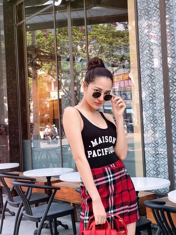 Một lần khác, Bảo Anh diện váy kẻ màu đỏ sặc sỡ hơn, kết hợp với túi xách cùng tone tạo sự trẻ trung, nổi bật.