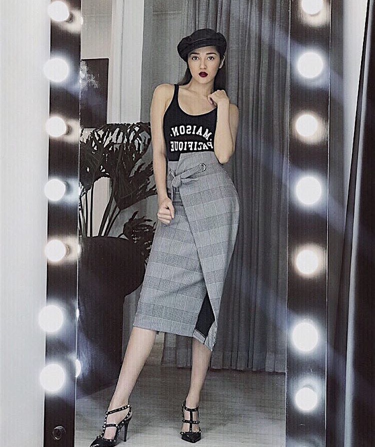 Bảo Anh diện chiếc áo này với chân váy kẻ caro, hot item hiện nay. Cô nàng còn đội thêm chiếc mũ baker boy cực sành điệu.