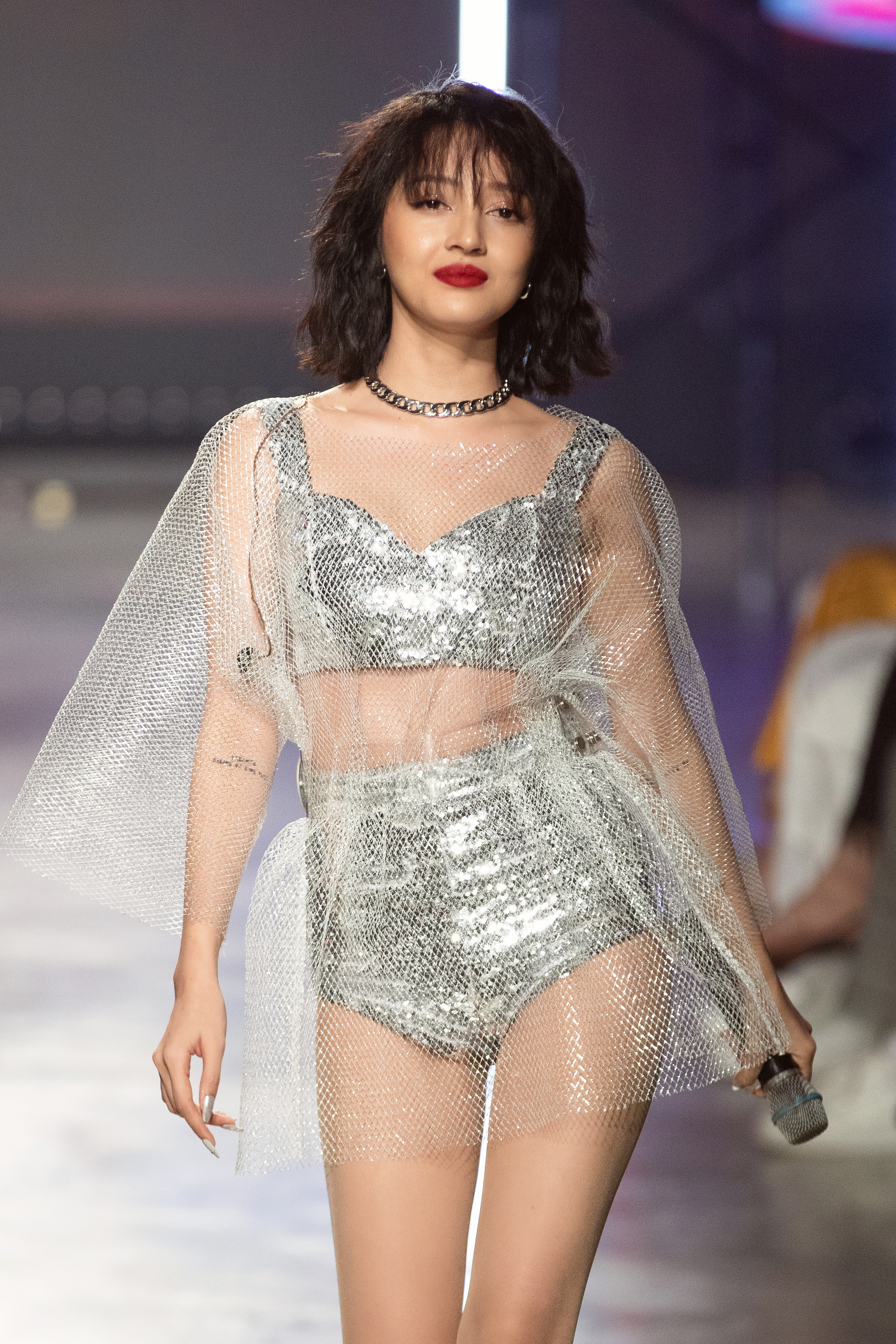 Xuất hiện lần đầu tiên trên sàn diễn thời trang trong bộ sưu tập của NTK Hà Nhật Tiến, Trần Thanh Tâm có cách gây ấn tượng ngoài ý muốn. Cô mặc set đồ màu trắng layer với áo khoác ngoài. Thần thái sắc lạnh hút mắt mọi ánh nhìn trên đường runway.