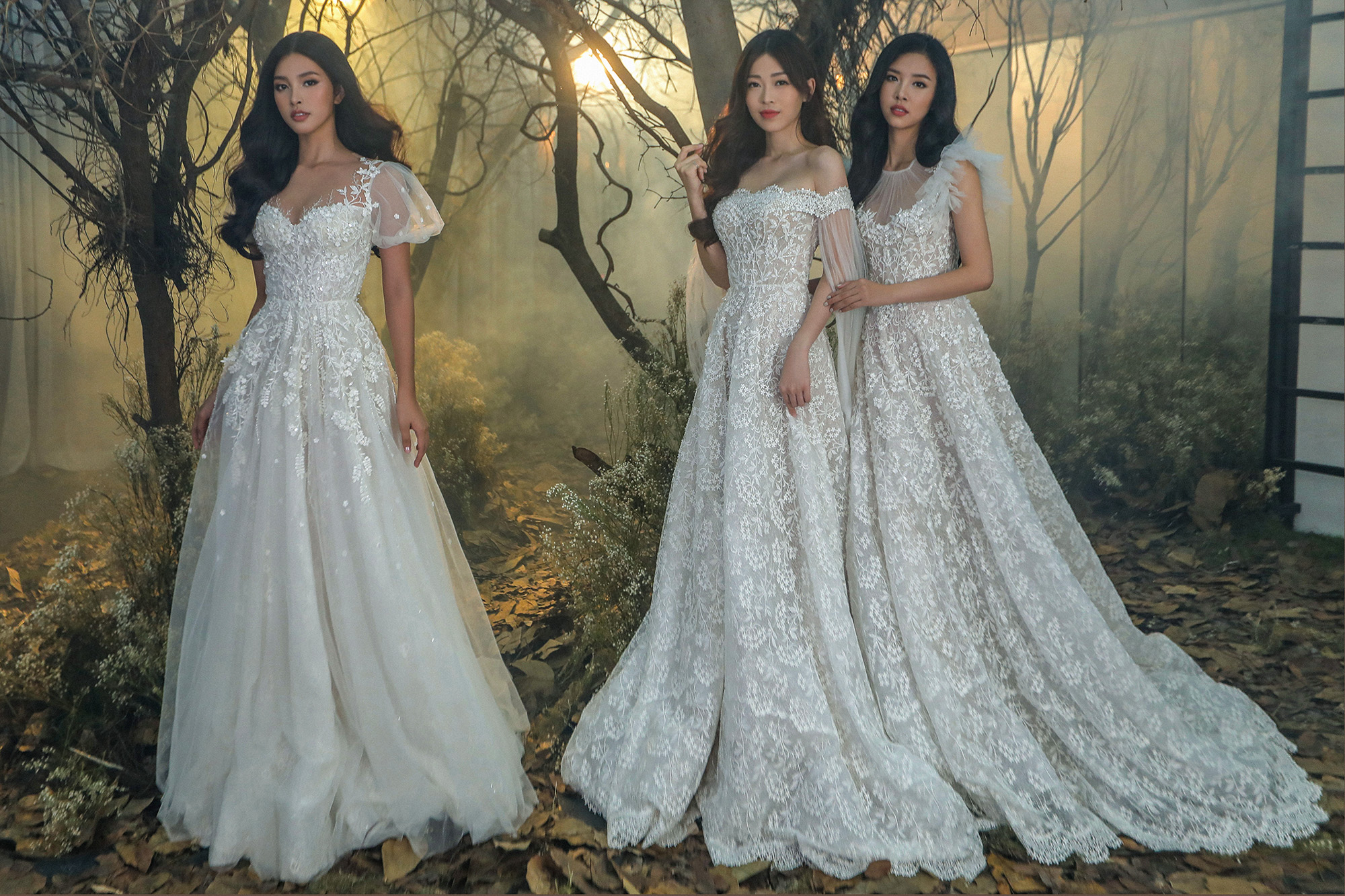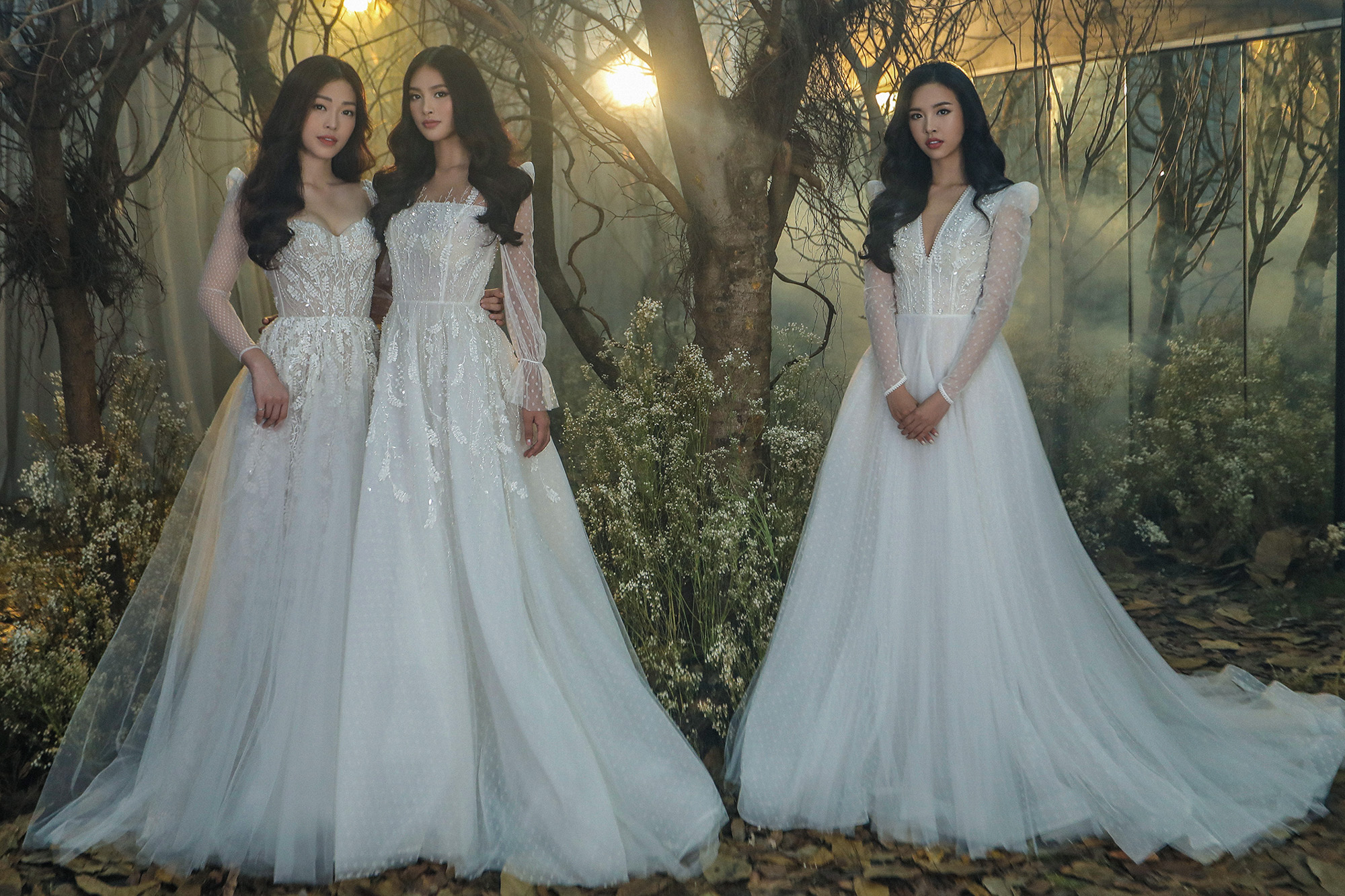 Những chiếc đầm cưới tay phồng mang âm hưởng hoàng gia, những thiết kế cúp ngực gợi cảm với tùng váy xếp ly tinh tế hay những kiểu đầm cổ lọ phảng phất nét cổ điển gây chú ý với chi tiết xếp tầng mà Tiểu Vy, Phương Nga, Thúy An trưng diện trong bộ ảnh cũng khiến các tín đồ thời trang cũng như nhiều cô dâu ngây ngất.