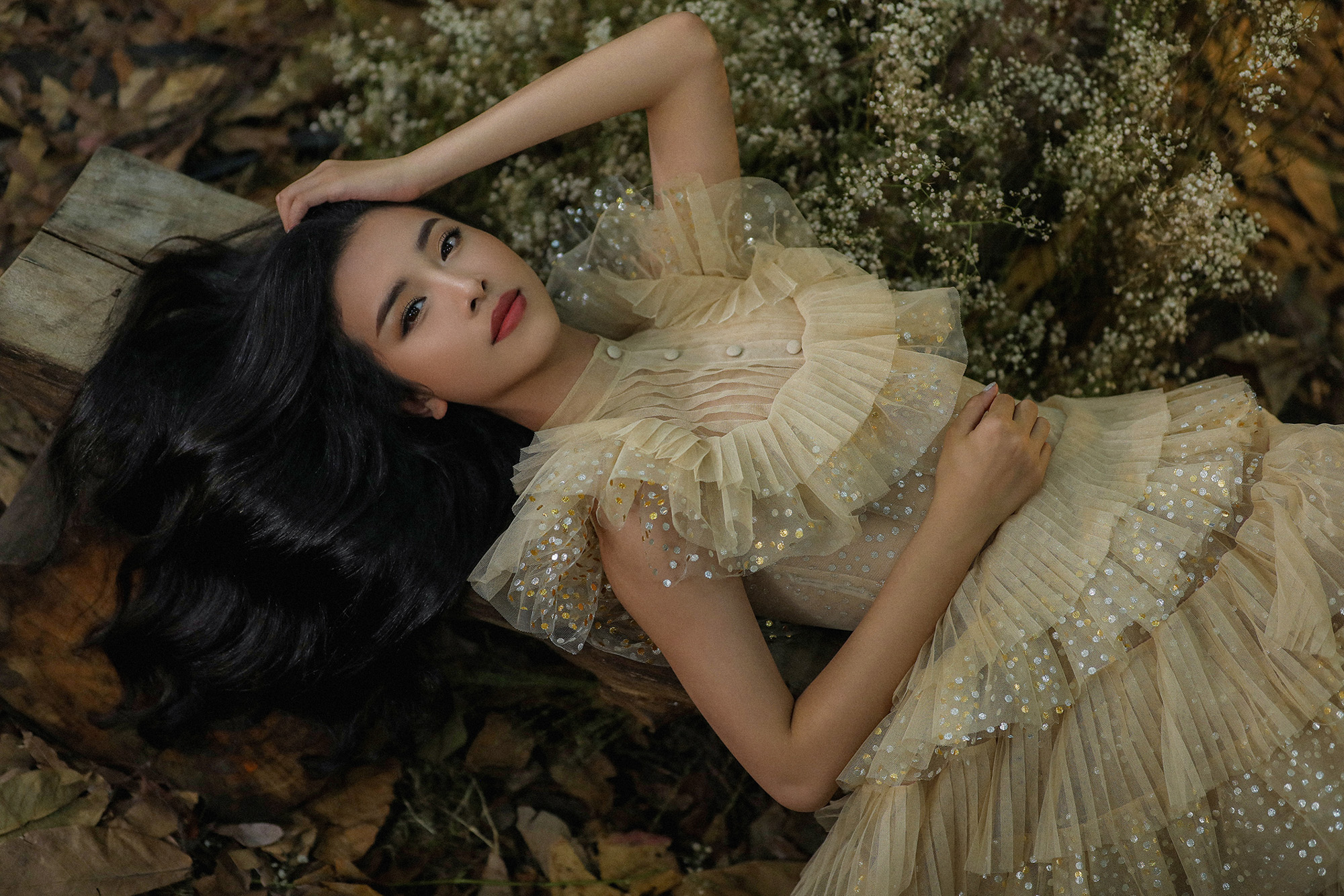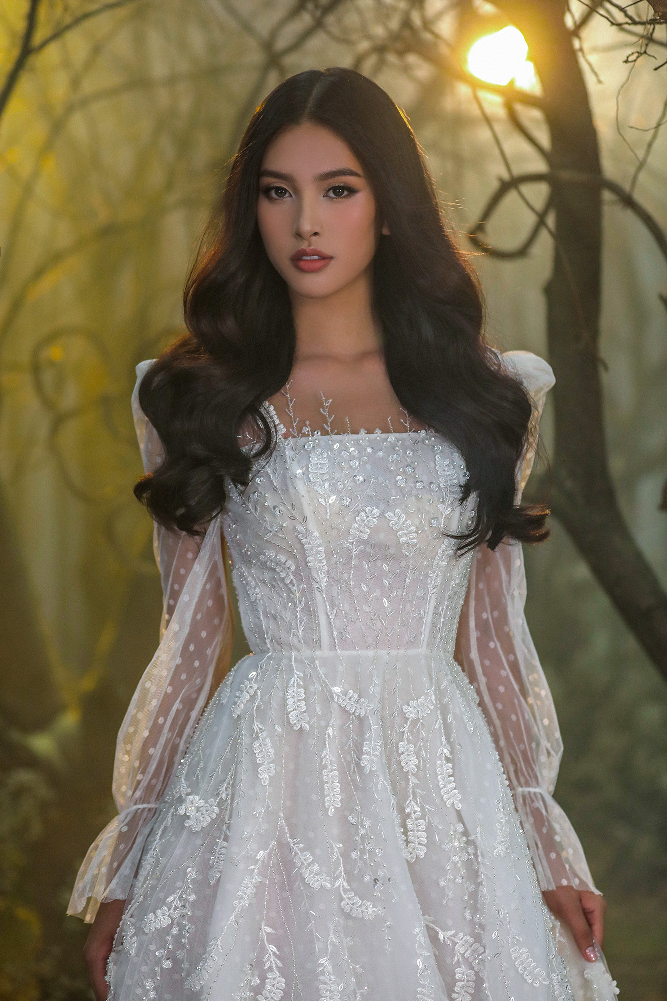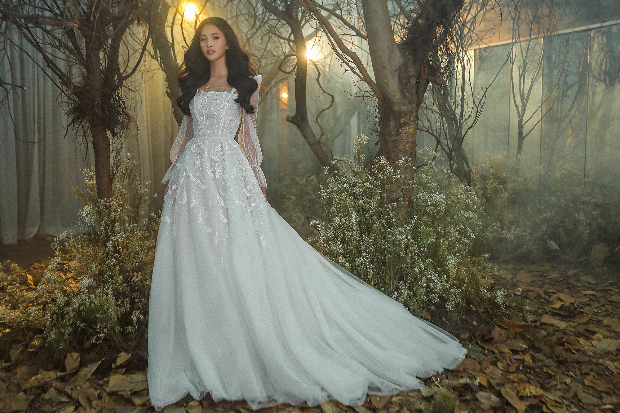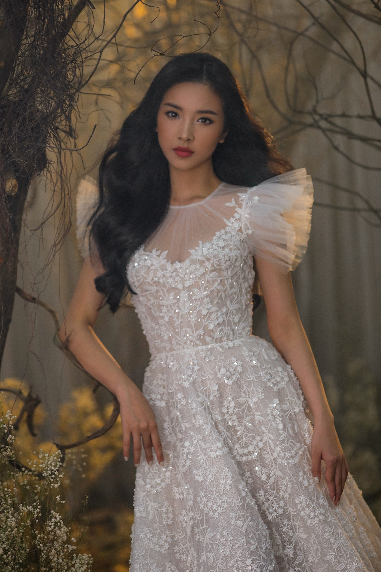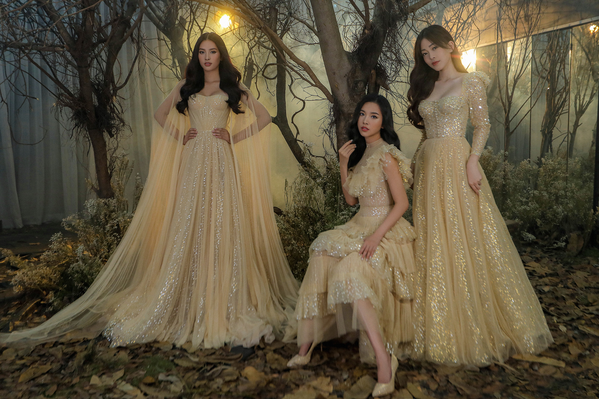 Qua đó, nhà mốt cho thấy sự tài tình, khéo léo khi “biến” top 3 hoa hậu trở thành những nữ thần xinh đẹp, khoác lên mình những chiếc đầm cưới lộng lẫy xuất hiện giữa khung trời mùa thu.