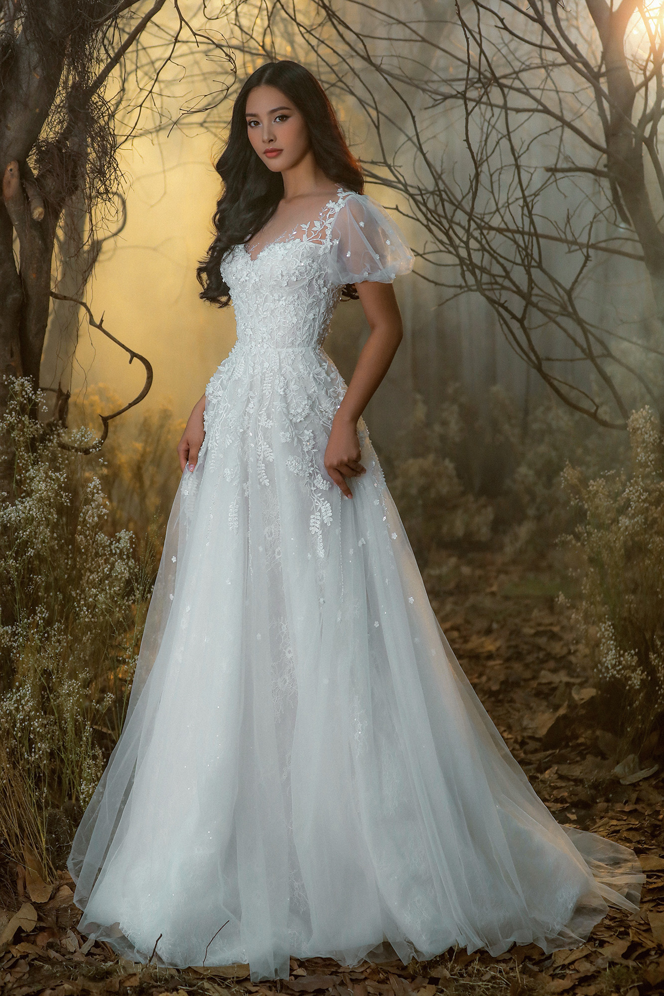 Bên cạnh đó, mỗi bộ cánh trong BST đều được NTK sử dụng chất liệu mềm mại như voan, lưới, organza, chiffon, thêm thắt họa tiết ren cầu kỳ, độc đáo để mang đến sự thanh lịch tuyệt đối, giúp các cô dâu toát lên vẻ nữ tính, cuốn hút trong ngày trọng đại.