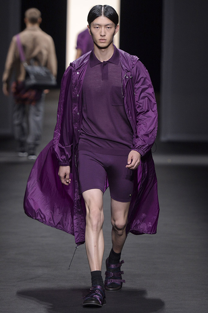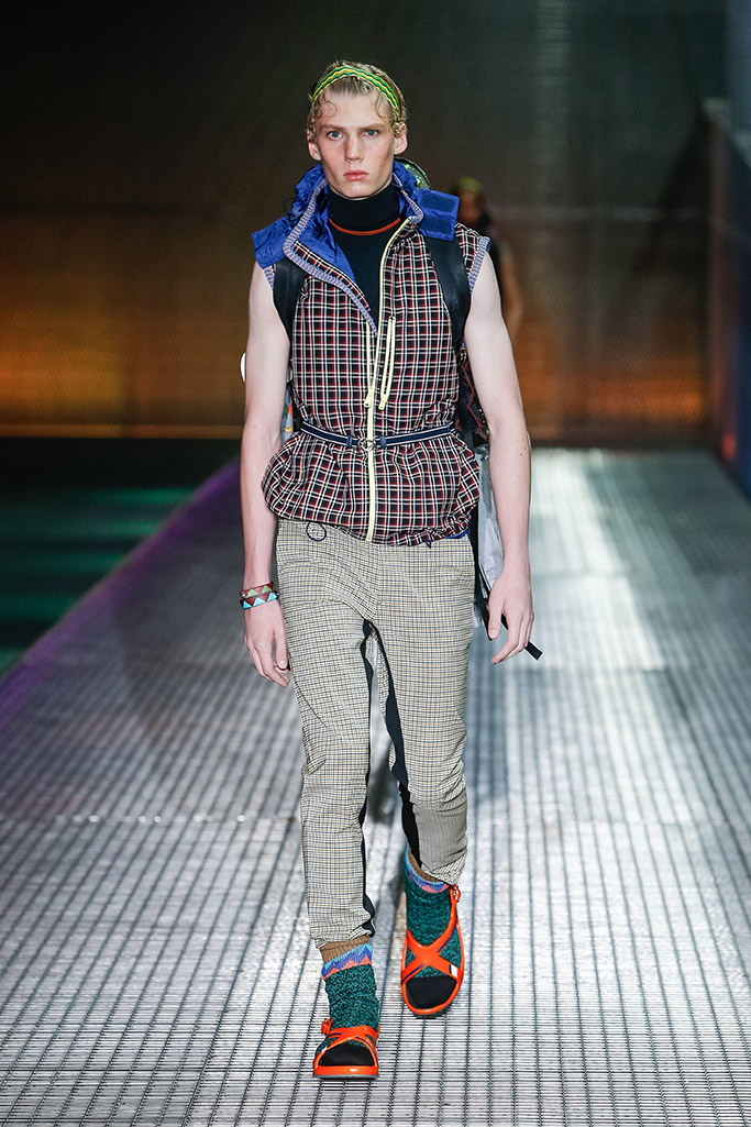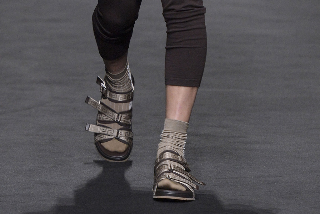 Từ năm ngoái, Versace đã giới thiệu phong cách độc đáo này trên sàn diễn, nhưng thay vì những đôi dép lê bá đạo như năm nay, hãng sử dụng sandal đan dây.