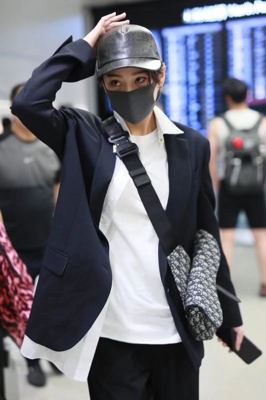 Người đẹp Cbiz chọn áo thun trắng mix cùng quần tây ống rộng khoác ngoài áo blazer xanh đen cùng phụ kiện túi đeo chéo đến từ nhà mốt Dior