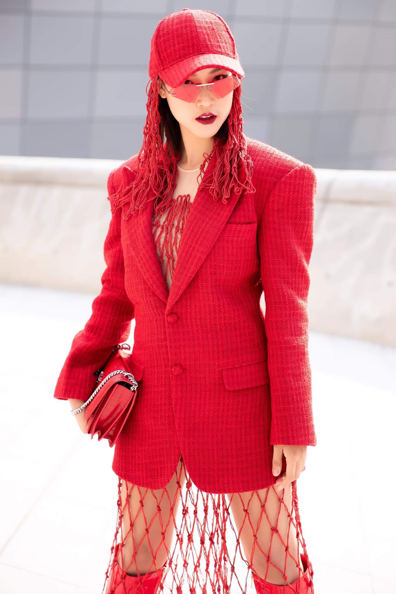 Bộ vest đỏ form dáng rộng của NTK Lý Giám Tiền được cô kết hợp với váy lưới, giày boots, mắt kính cùng màu khiến nữ MC trở nên thật cá tính.