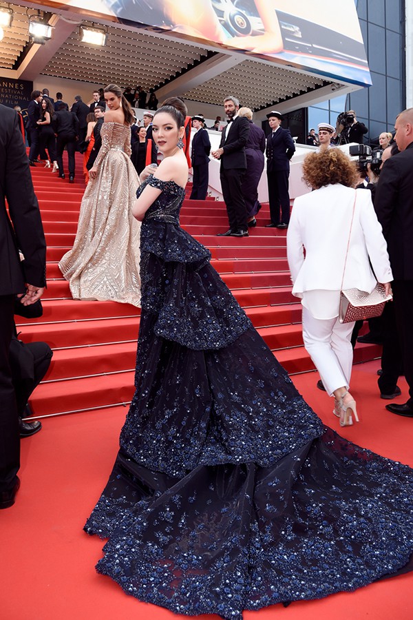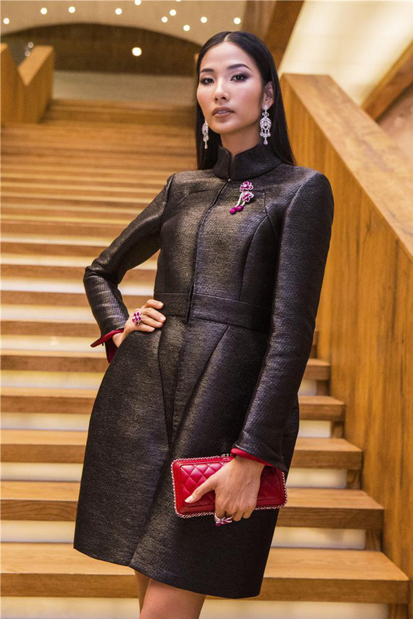 Trong đó, váy đen óng làm bằng chất liệu vải đặc biệt đến từ nhà mốt Chanel. Thiết kế nằm trong bộ sưu tập Chanel Paris Shanghai Metier d'Art Collection có giá 15.000 USD (hơn 333 triệu đồng). Điểm nhấn của bộ cánh nằm ở trang sức gồm bông tai, nhẫn và chiếc cài áo màu hồng tím. Nhẫn bươm bướm làm từ đá ruby và kim cương có giá 35.000 USD (hơn 777 triệu đồng). Người đẹp còn đeo thêm chiếc nhẫn hình bông hoa cùng chất liệu có giá 25.000 USD (hơn 555 triệu đồng), cài áo hoa kim cương giá 180.000 USD (4 tỷ đồng), bông tai vàng trắng 18k đính kim cương giá 68.000 USD (1,5 tỷ đồng).