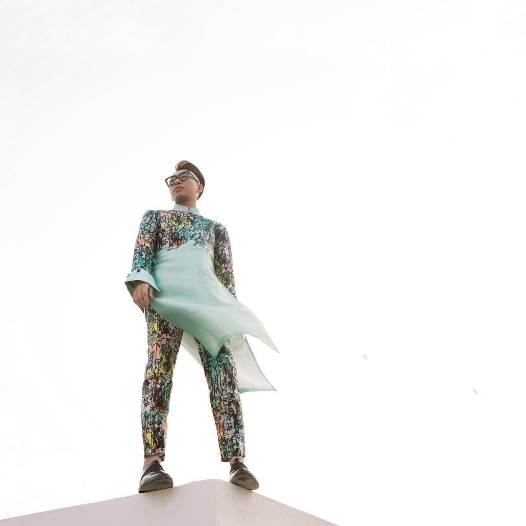 Stylist Hoàng Ku chọn riêng set áo dài cách tân cá tính với họa tiết nổi bật nhưng không quá sặc sỡ.