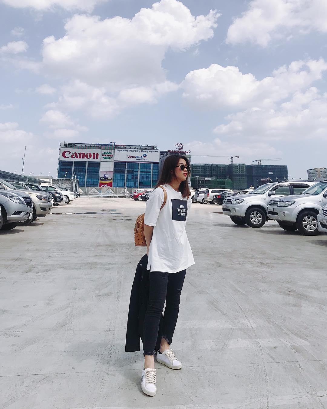 Ngọc Thảo chọn style đơn giản khỏe khoắn với áo thun trắng và giày thể thao.