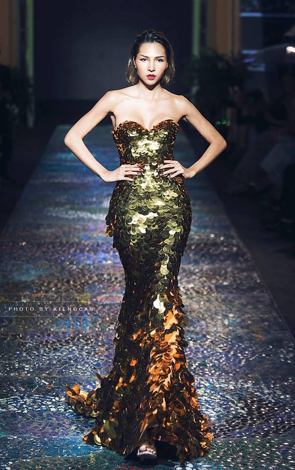 Siêu mẫu Minh Triệu trên sàn runway trong thiết kế đầm tiên cá.