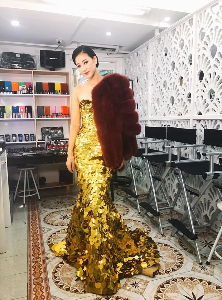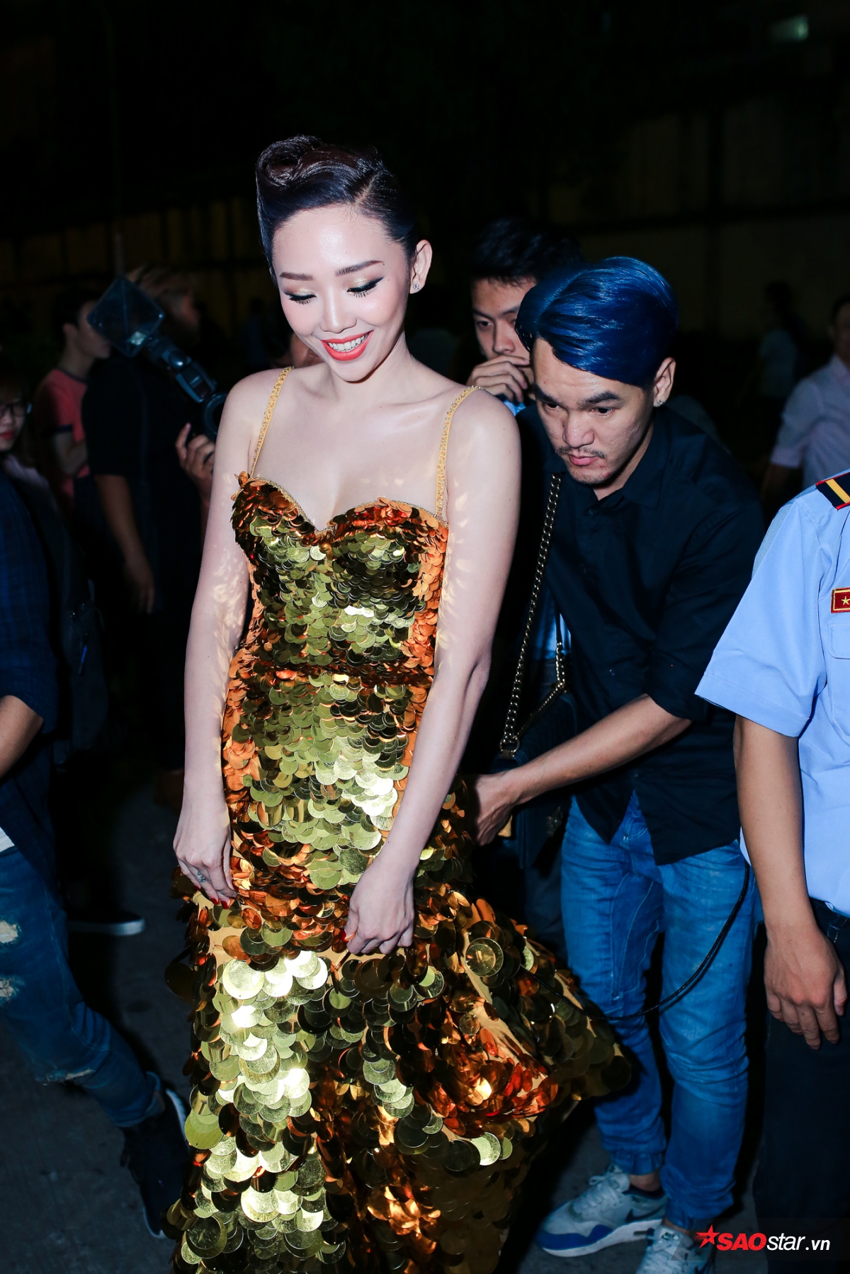 Tóc Tiên với chiếc đầm tiên cá vô cùng lấp lánh cùng màu vàng bắt mắt.