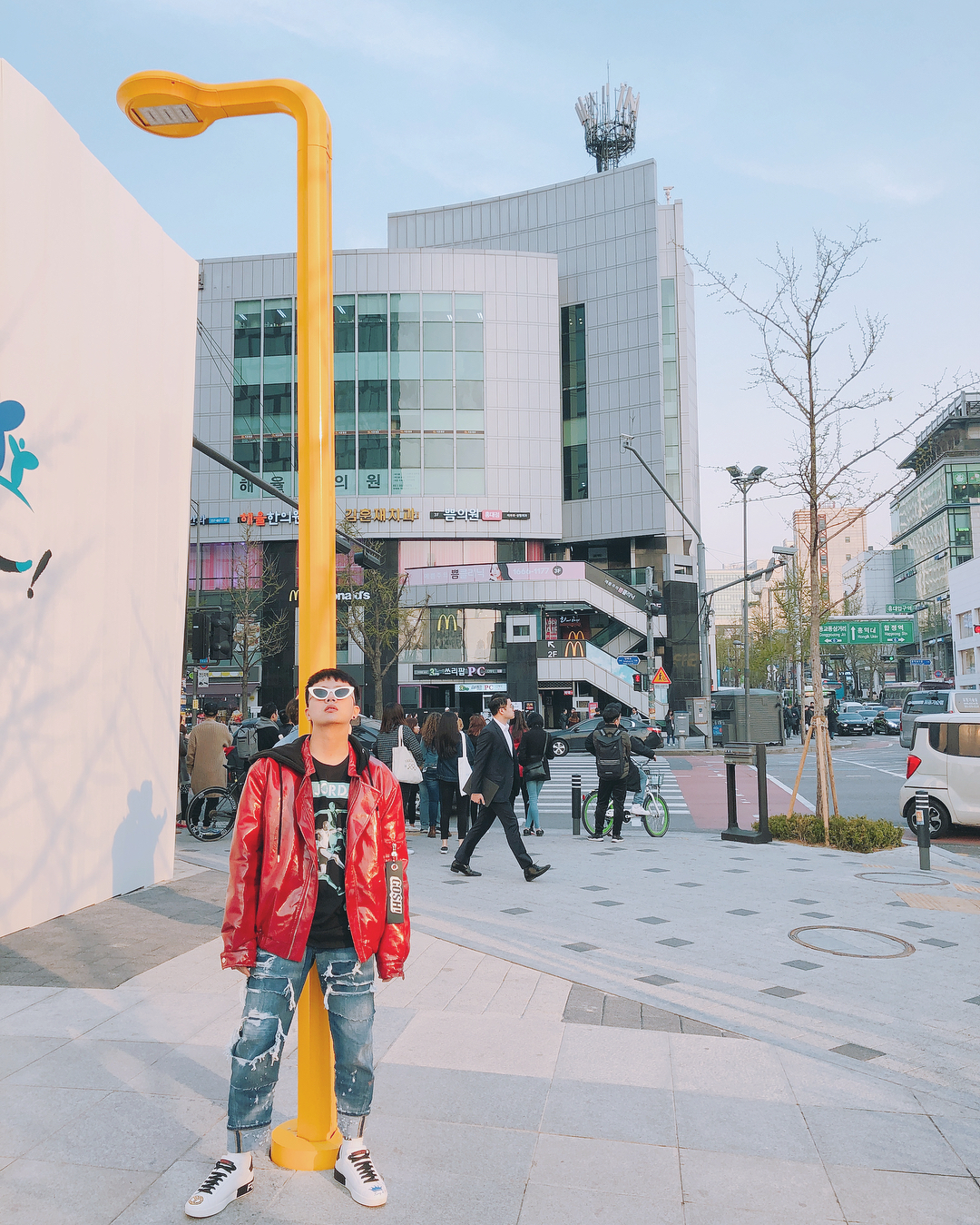Duy Khánh Zhou Zhou chưng diện outfit cá tính, quần jeans rách, áo khoác PVC đỏ là cách mà anh chàng thu hút mọi ánh nhìn khi xuống phố.