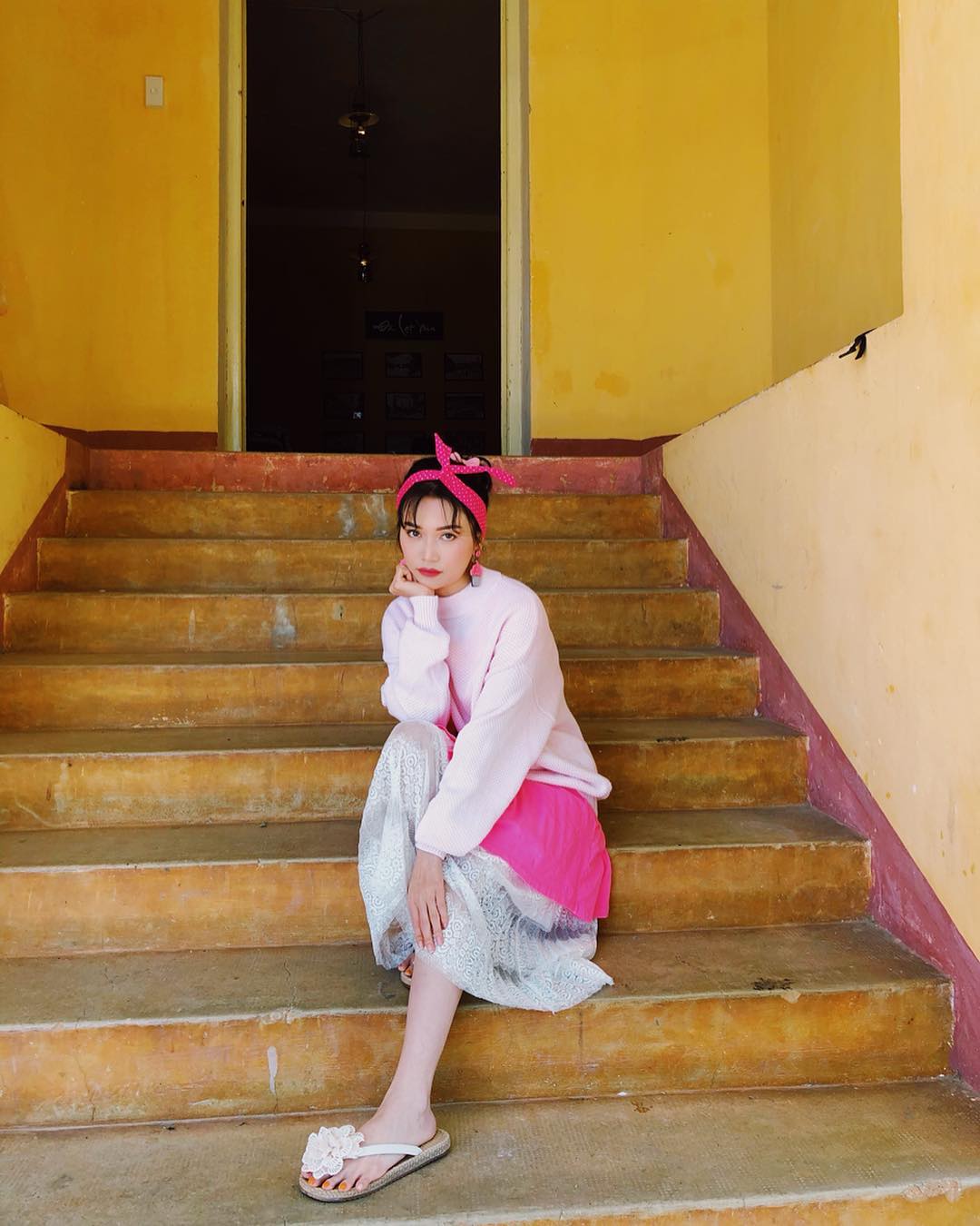 Sĩ Thanh xuống phố với outfit kẹo ngọt gồm chân váy dập li và băng đô tai thỏ. Tuy nhiên, đôi dép hoa lại khiến cô nàng mất đi vẻ chỉn chu, nếu thấy bằng giày búp bê hay bata trắng thì “gái ế” sẽ xinh hơn rất nhiều.