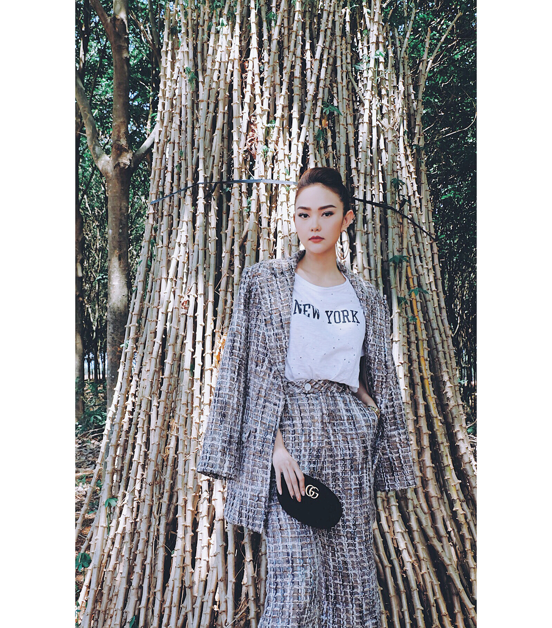 Combo áo khoác vải tweet cùng chân váy được Minh Hằng mặc cùng áo phông basic, đem đến vẻ ngoài sang trọng.