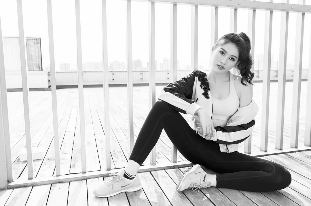 Chế Nguyễn Quỳnh Châu đem đến phong cách sporty chic với combo áo khoác thể thao cùng quần legging. Kiểu tóc cột cao đem đến vẻ trẻ trung, năng động.