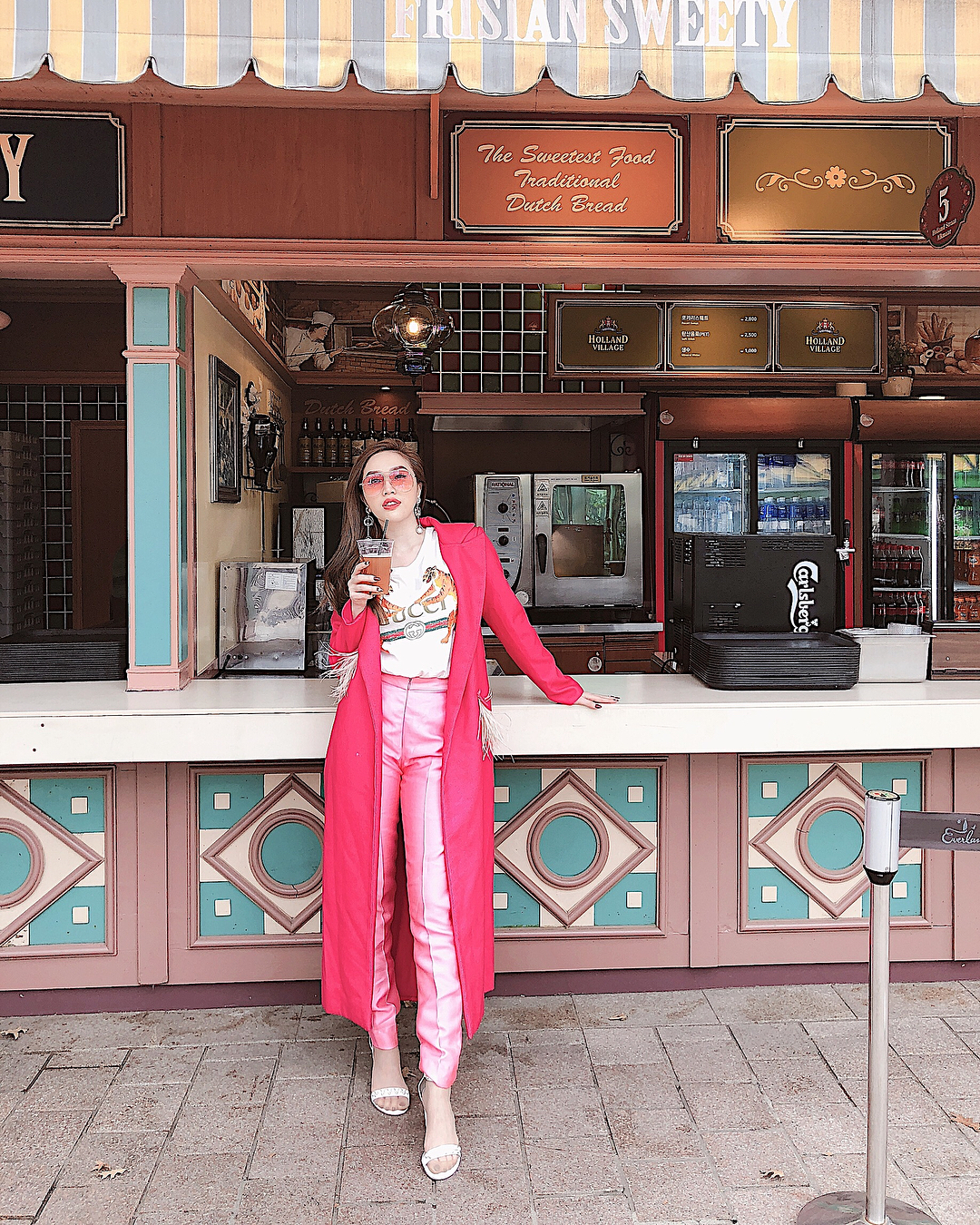 Mặc ai mê mệt màu đen cá tính, Bảo Thy cứ mãi trung thành với sắc hồng ngọt ngào. Cô nàng xuống phố với cả cây hồng chói lọi từ quần đến áo khoác, đến cả kính mát cũng phải hồng luôn thì nữ ca sĩ mới vừa ý.
