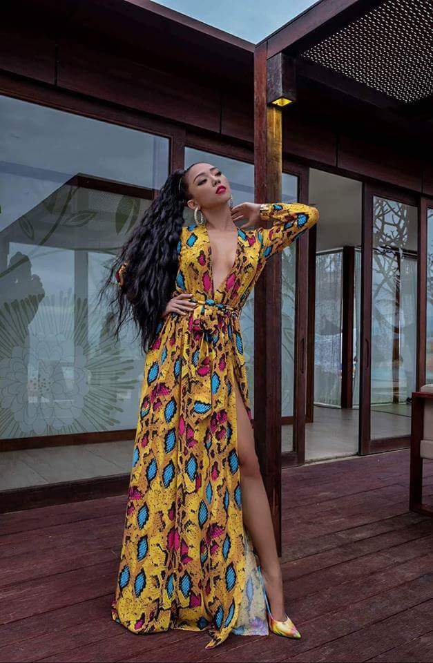 Tóc Tiên đốt mắt người nhìn với bộ váy vàng đúng mốt mùa hè. Phần ngực xẻ sâu tới rốn khoe trọn đôi gò bồng đào, tà váy cũng cắt cao, giúp tôn lên đôi chân thẳng tắp của người đẹp.