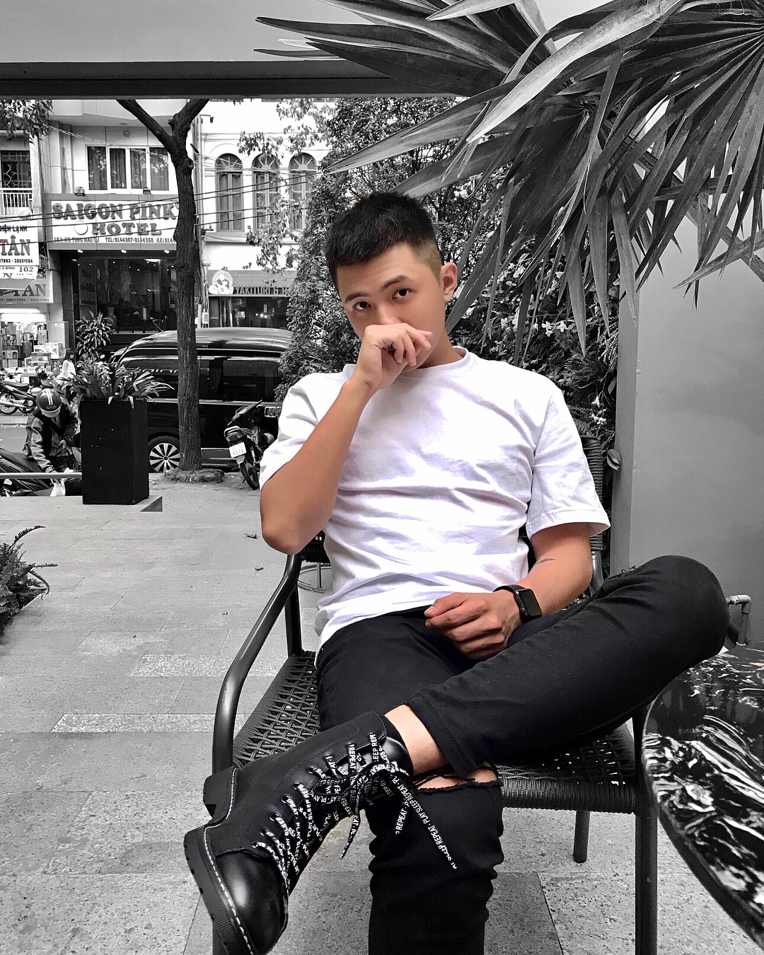 Gin Tuấn Kiệt - hot boy mới của Sing My Song diện áo thun và quần tây đen. Bộ cánh đơn giản nhưng hoàn toàn trẻ trung và nổi bật.