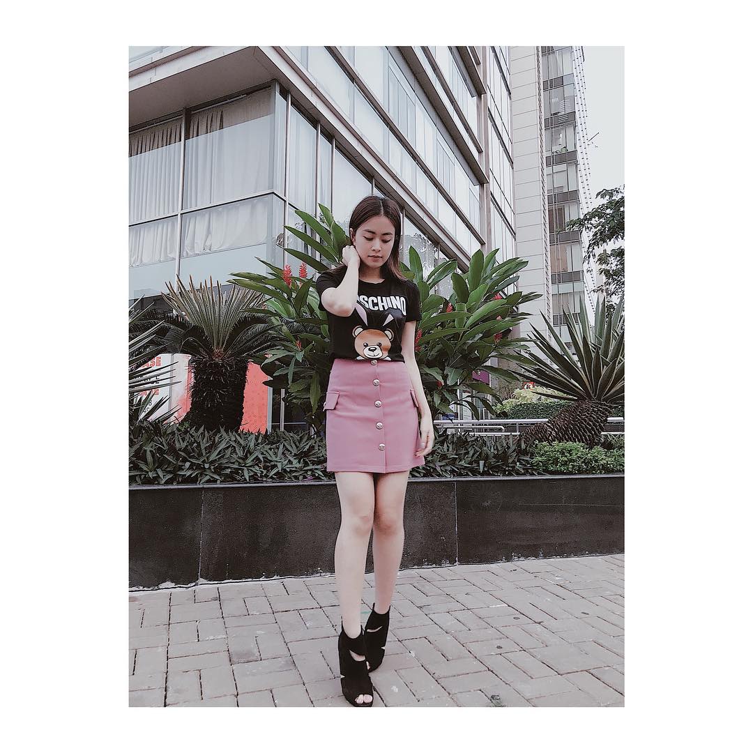 Hoàng Thùy Linh mặc outfit trẻ trung với áo thun Moschino và chân váy ôm. Nữ ca sĩ cũng để kiểu tóc rẽ ngôi giữa, chải nhẹ nhàng nhằm phù hợp với tổng thể.